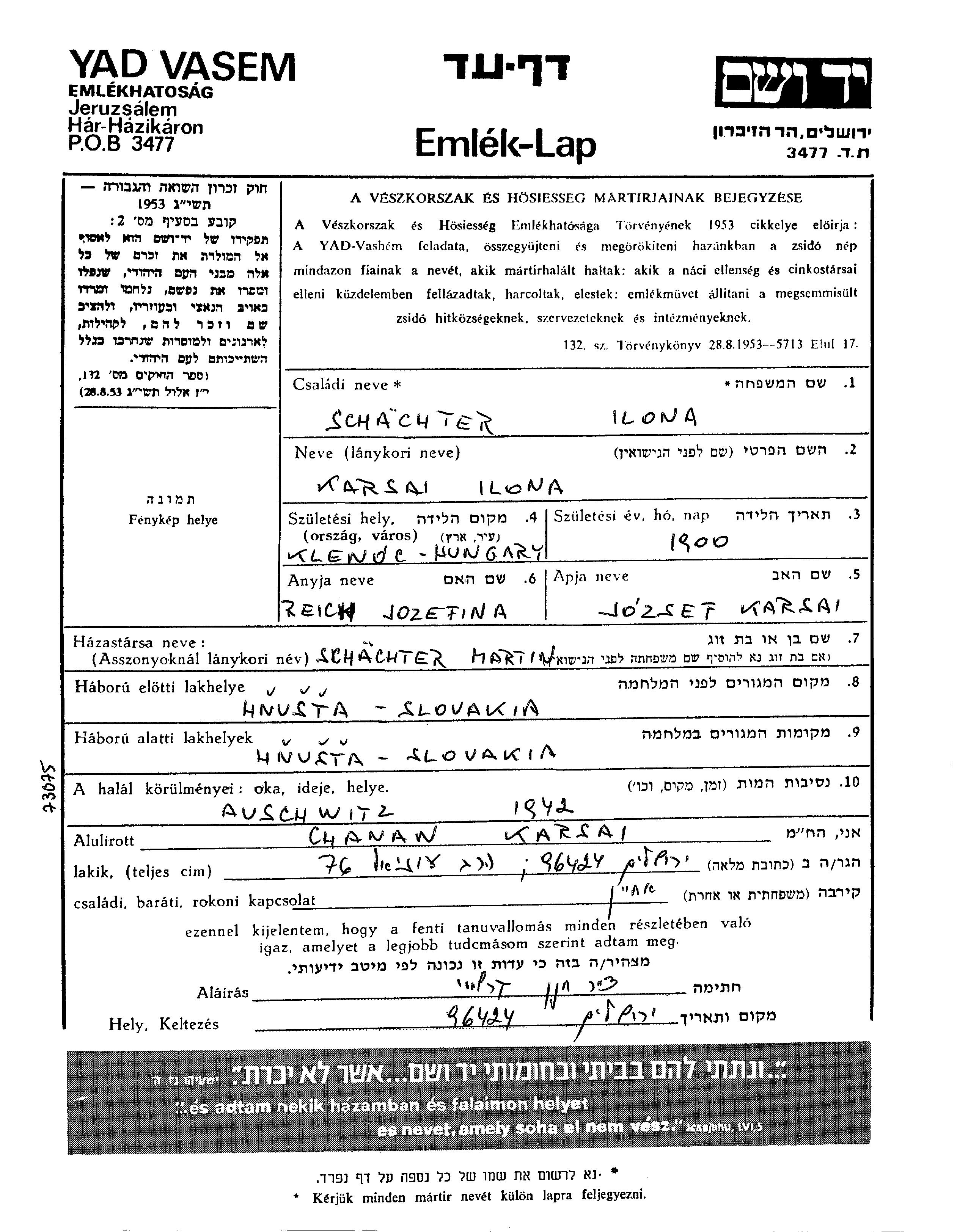 Ilona Schaechter née Karsai est née à Klenoc, Tchécoslovaquie en 1900, fille de Jozsef et de Josefina. Avant la seconde guerre mondiale elle vivait à Hnusta, Tchécoslovaquie. Pendant la guerre, elle était à Hnusta, Tchécoslovaquie.