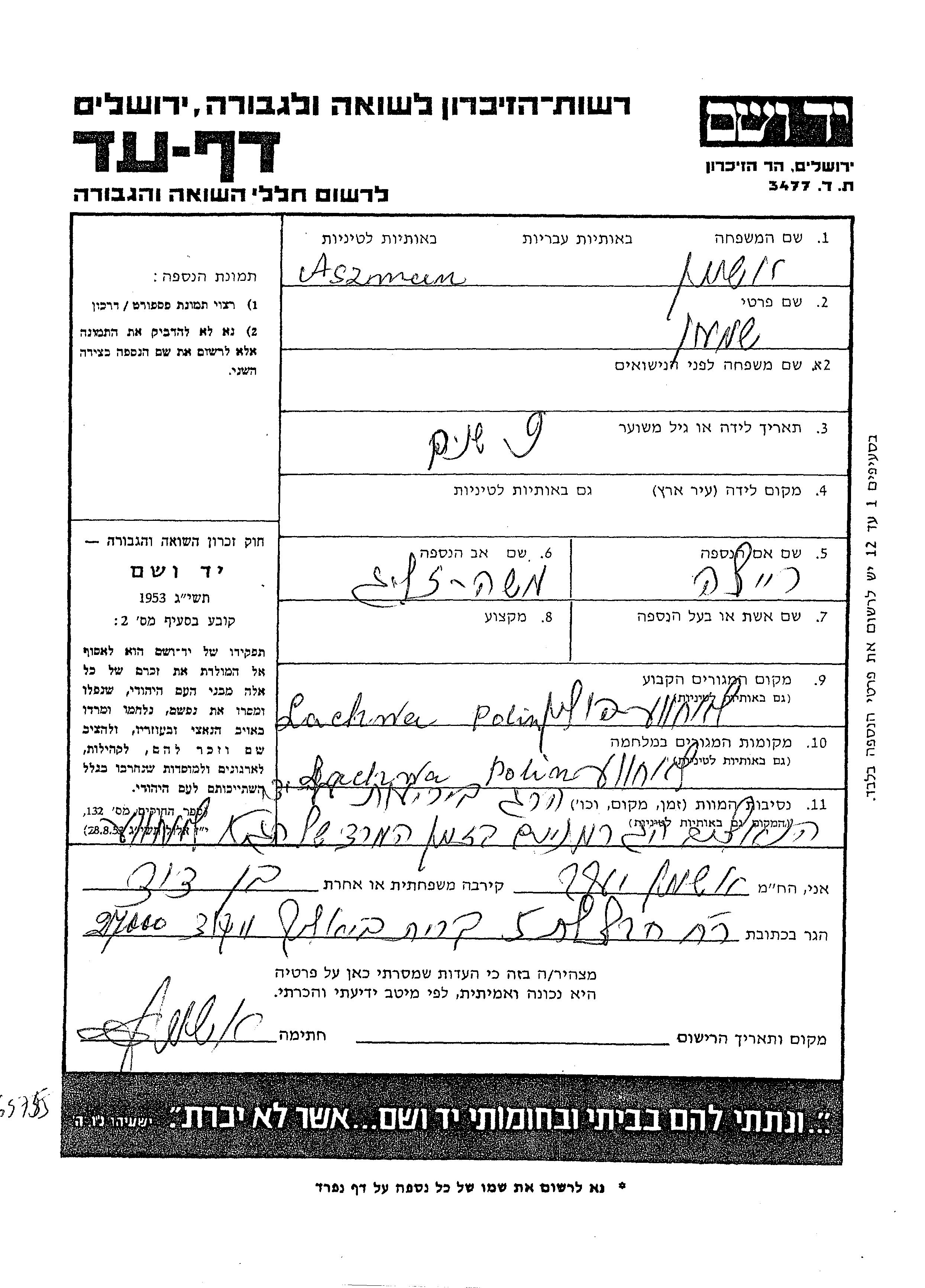 Aszman Shimon Lachwa, Pologne Feuille de témoignage