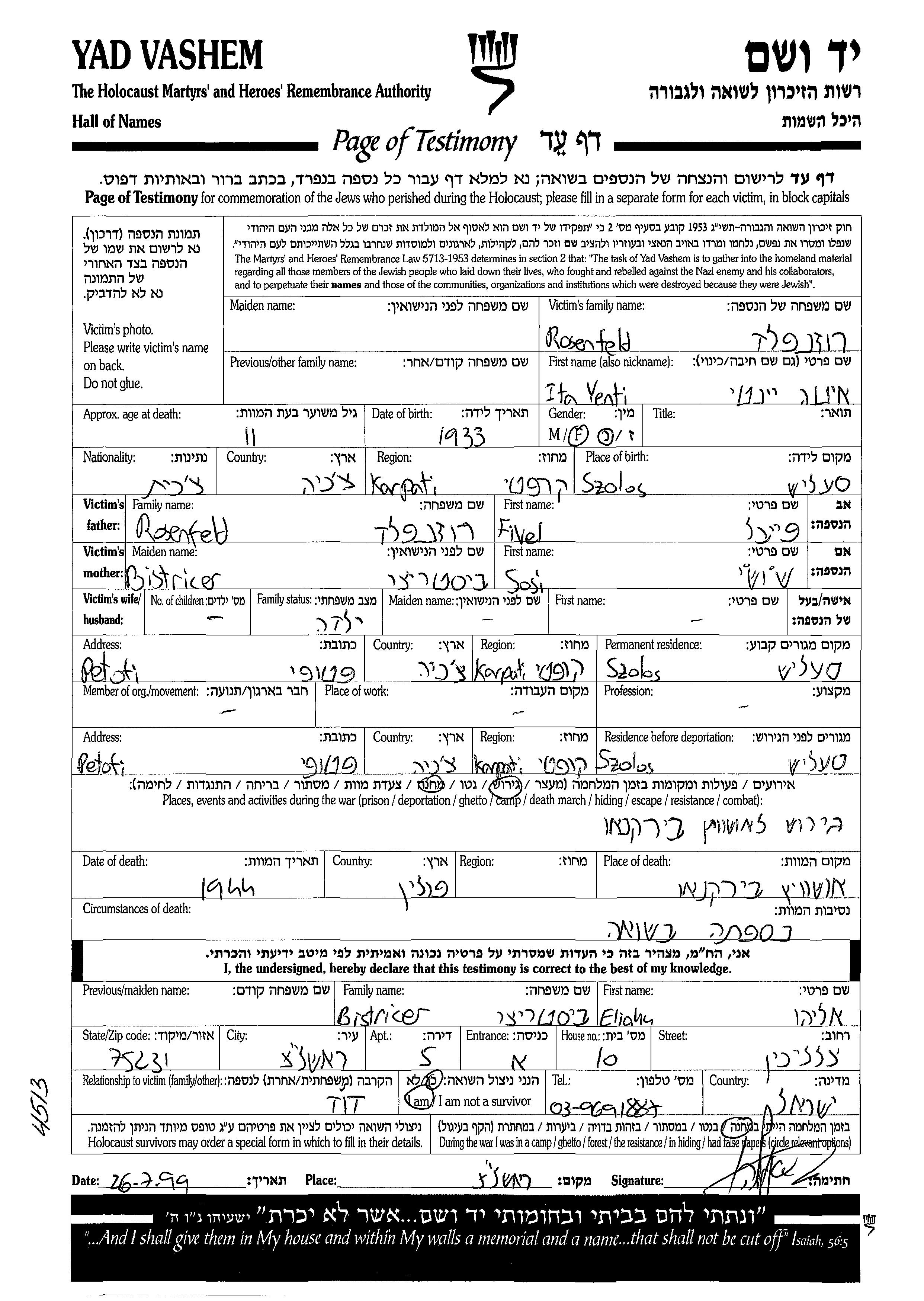 Rosenfeld Yenti Ita 1933 Szolos, Tchécoslovaquie Feuille de témoignage