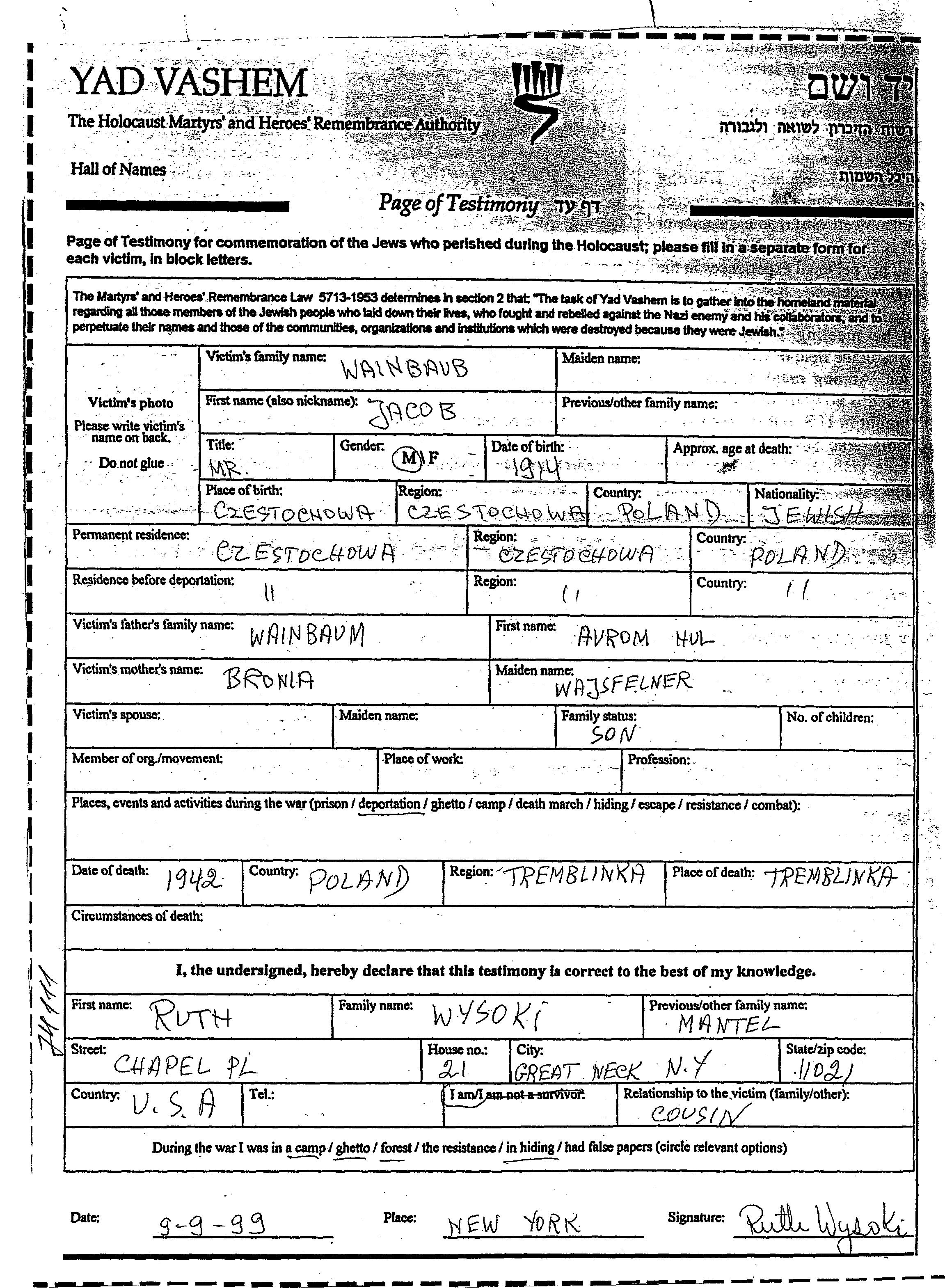 Wainbaum Jacob 1914 Czestochowa, Pologne Feuille de témoignage
