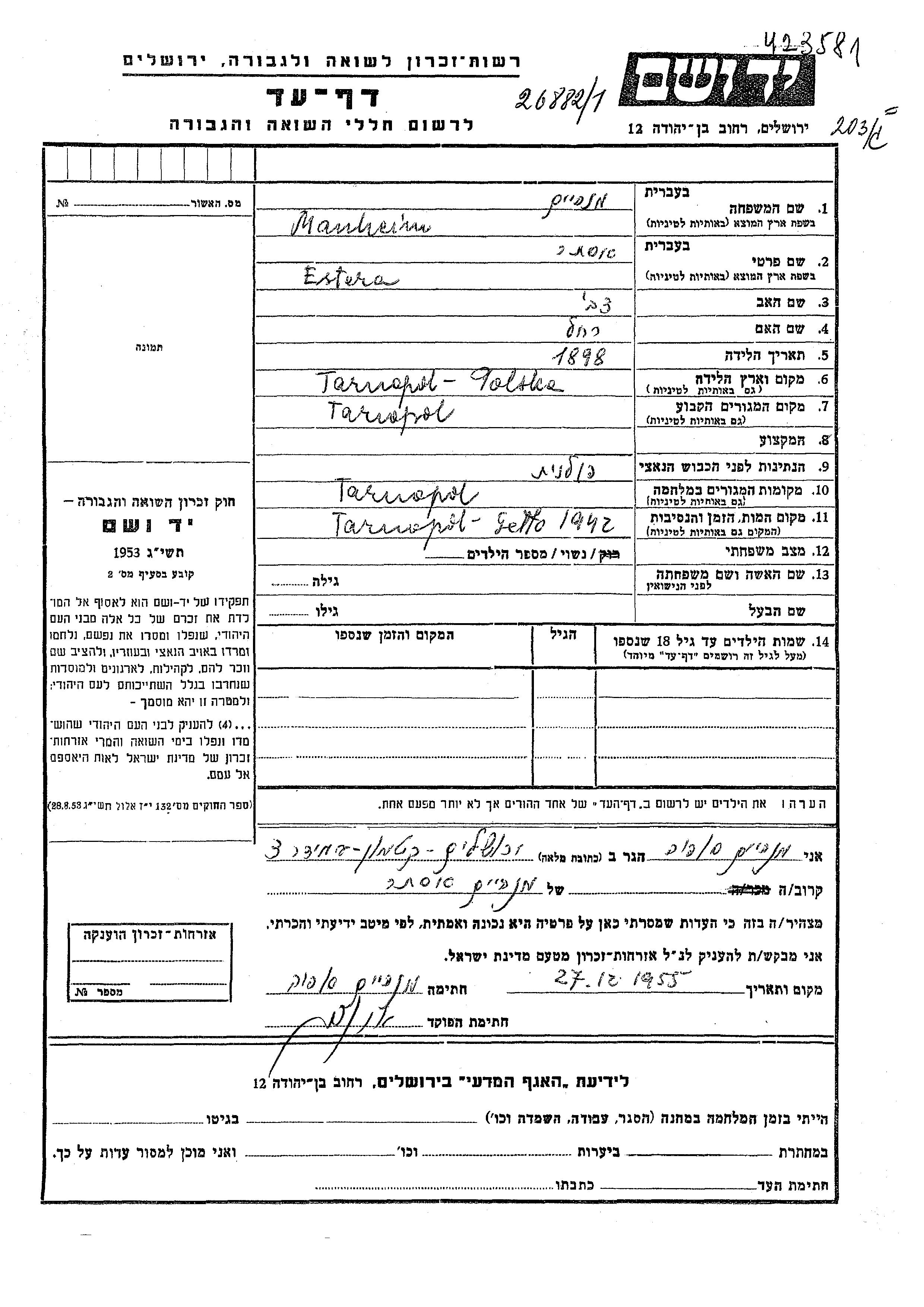 Estera Manheim est née à Tarnopol, Pologne en 1898, fille de Tzvi et de Rakhel. Elle était Mariée. Avant la seconde guerre mondiale elle vivait à Tarnopol, Pologne. Pendant la guerre, elle était à Tarnopol, Pologne.
