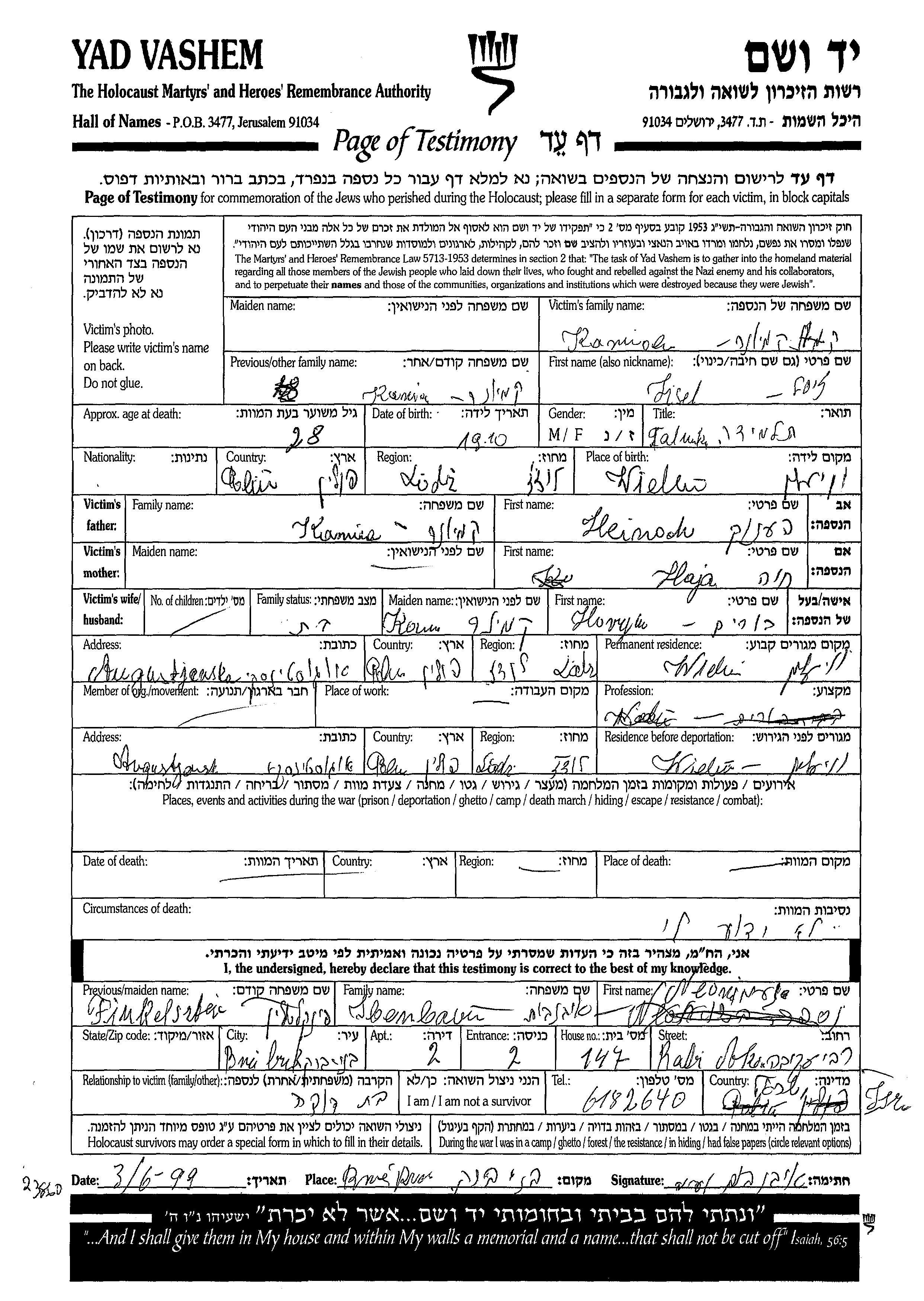 Yad Vashem - Pages of Testimony Names Memorial Collection
