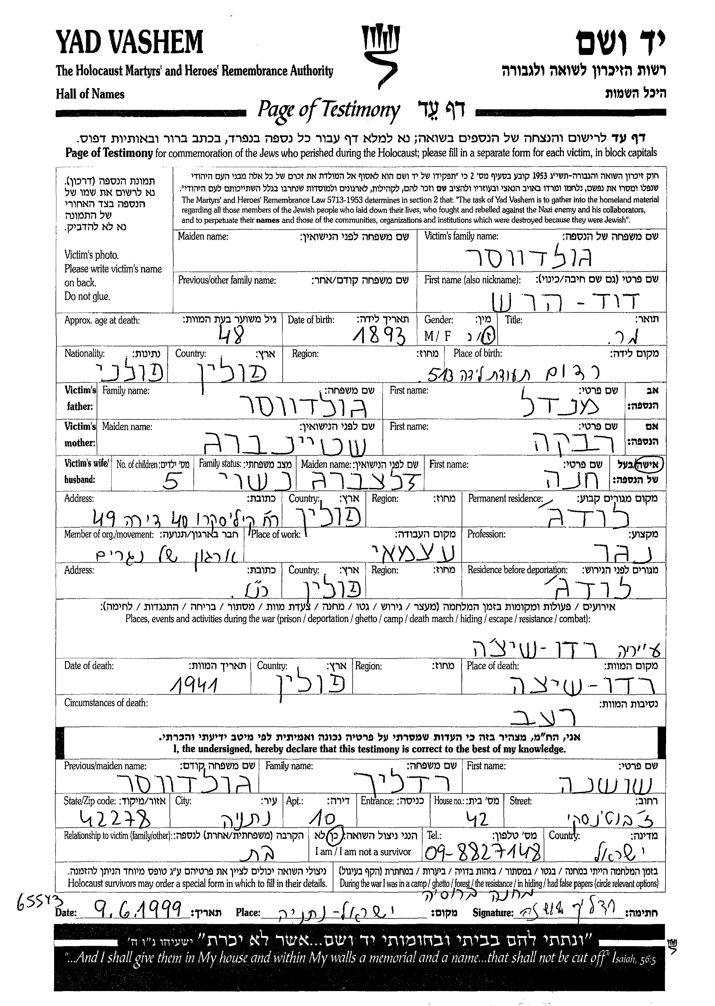 Goldvaser David Hersh 1893 Lodz, Pologne Feuille de témoignage