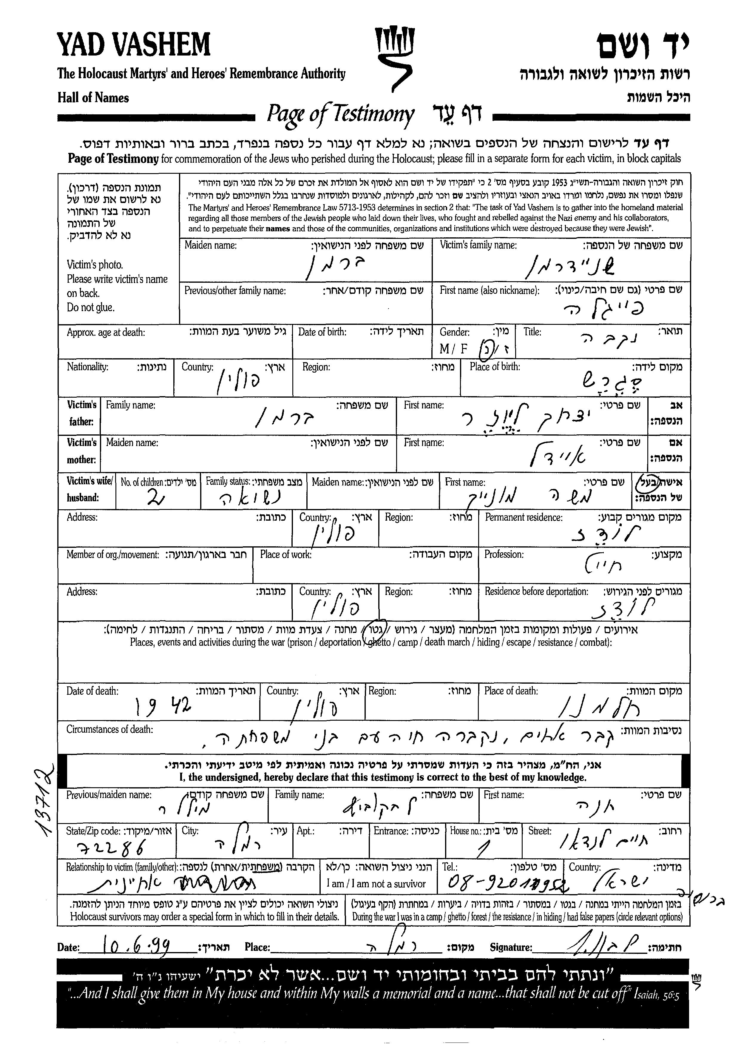 Yad Vashem - Pages of Testimony Names Memorial Collection