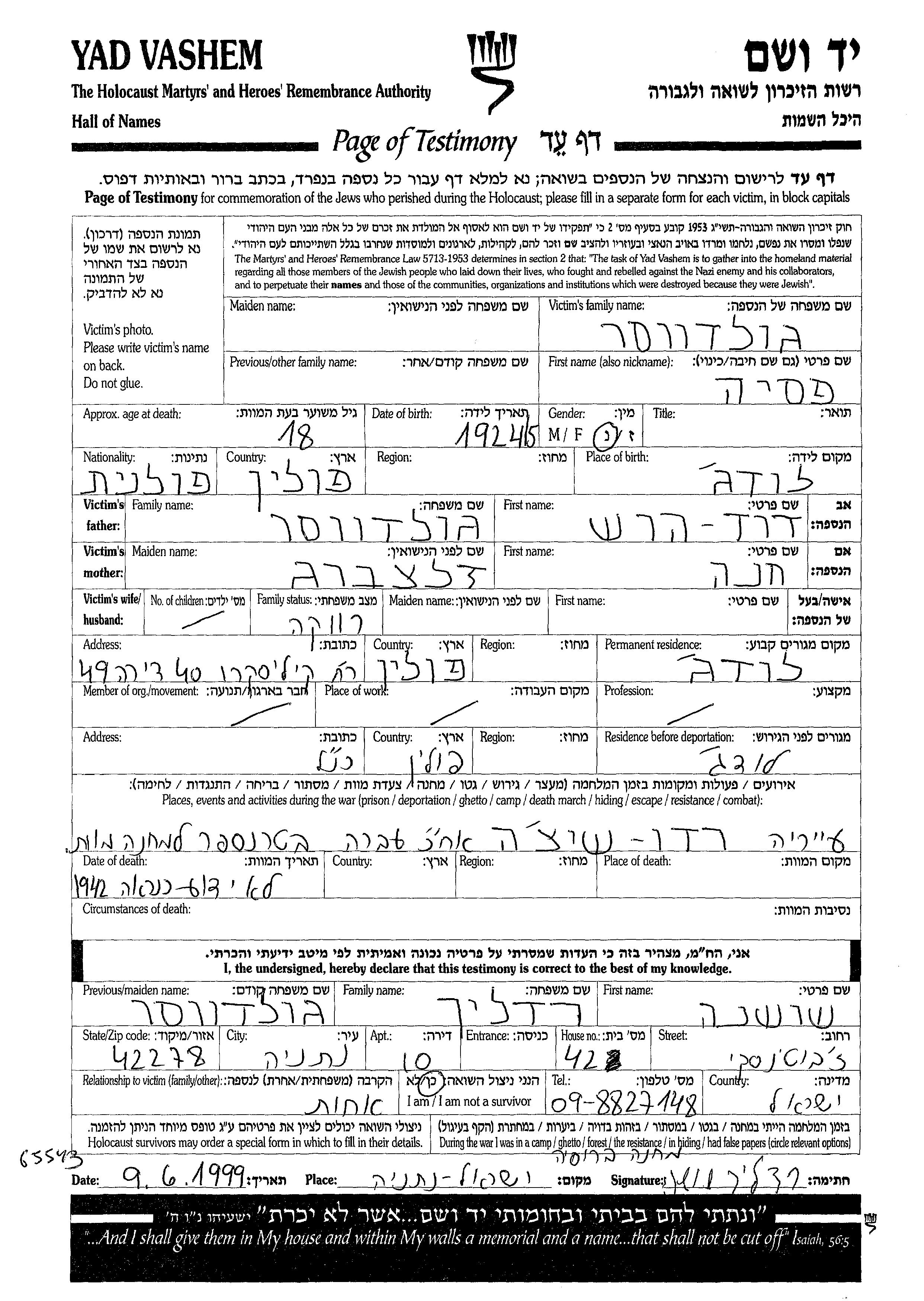 Yad Vashem - Pages of Testimony Names Memorial Collection