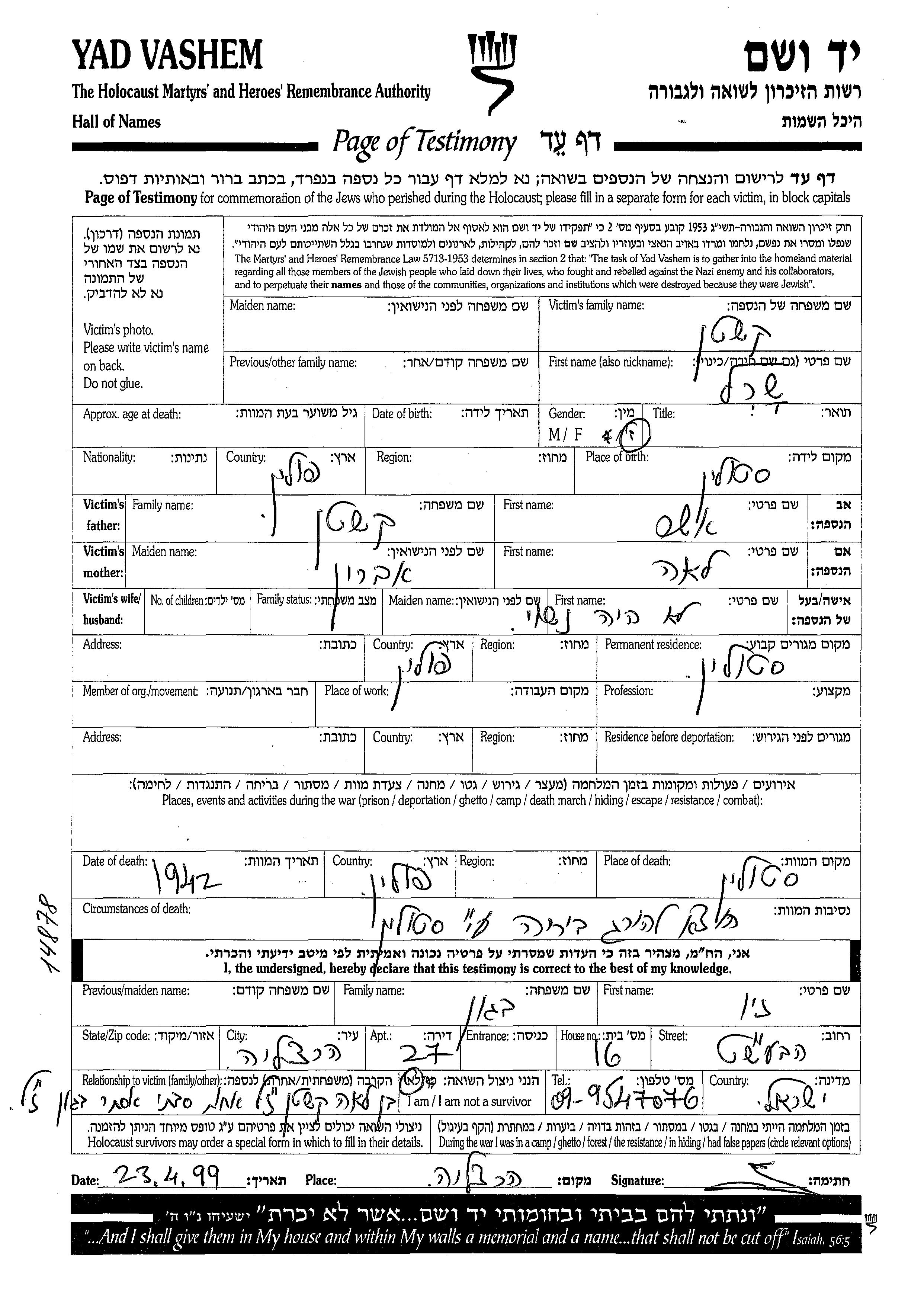 Yad Vashem - Pages of Testimony Names Memorial Collection