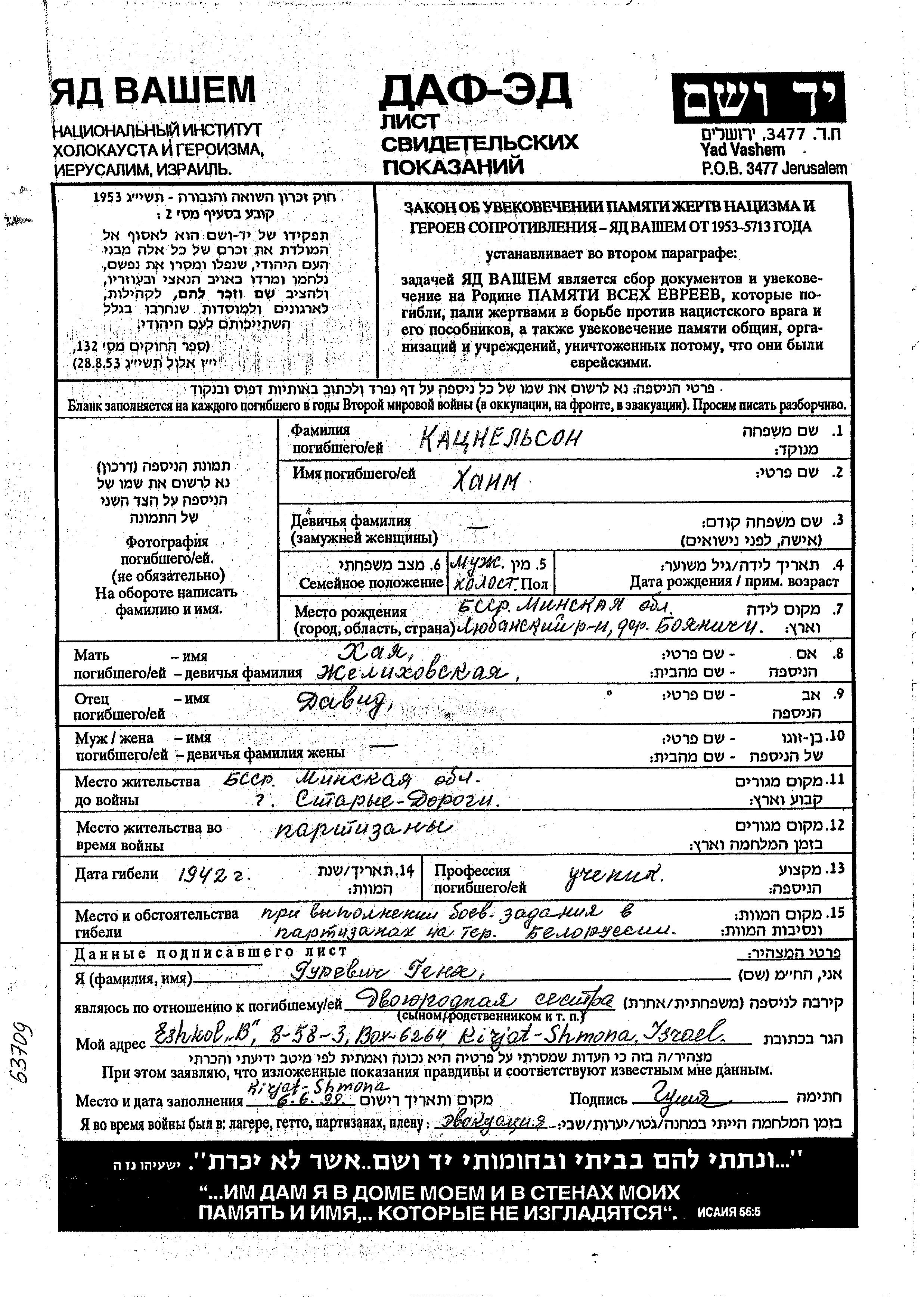 Katznelson Khaim Staryye Dorogi, Bélorussie (URSS) Feuille de témoignage