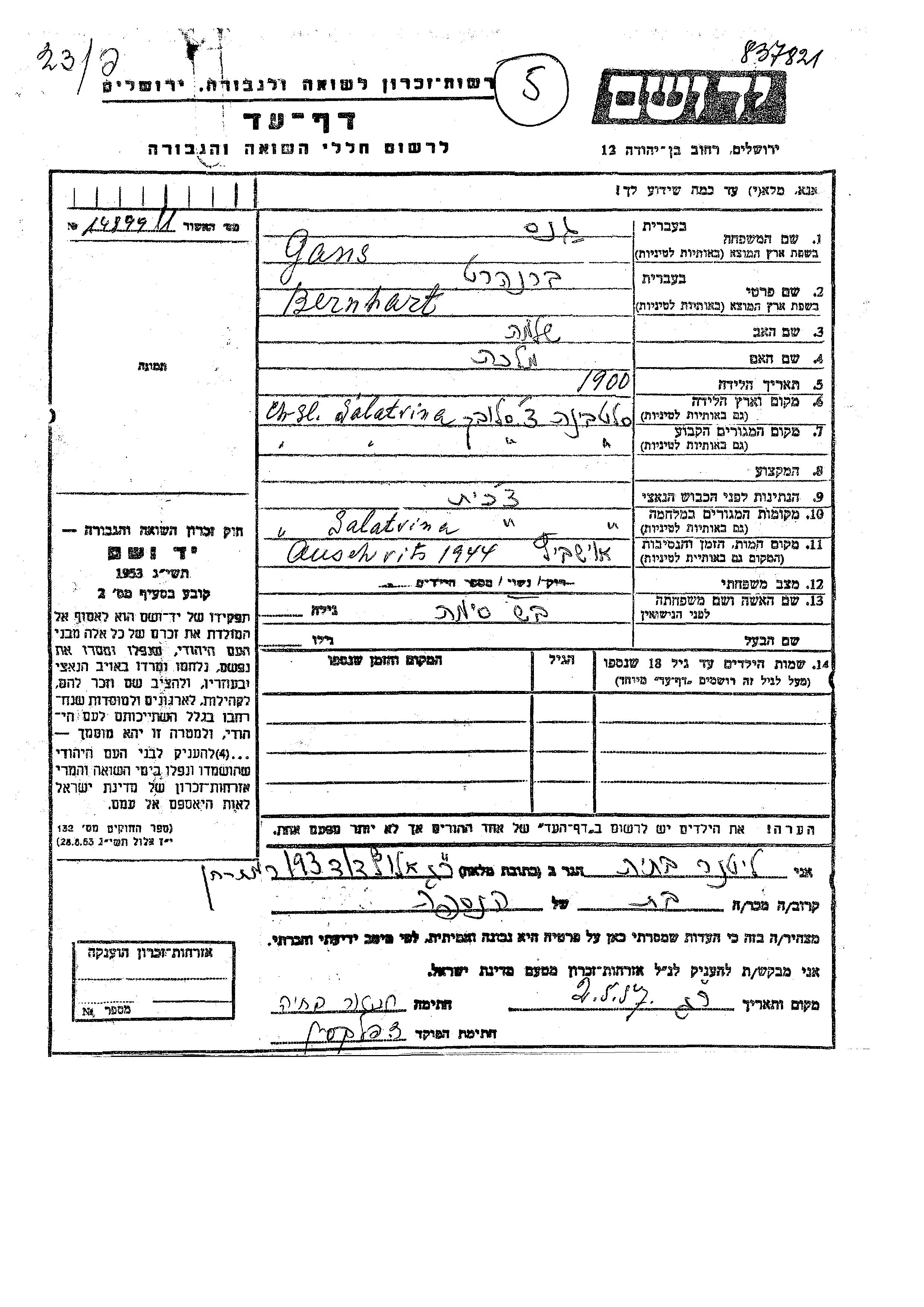 Bernhart Gans Ganes est né à Slatvina, Tchécoslovaquie en 1900, fils de Shlomo et de Malka. Il était Mariée à Sima née Bash. Avant la seconde guerre mondiale il vivait à Slatvina, Tchécoslovaquie. Au cours de la guerre, il était à Slatvina, Tchécoslovaquie.