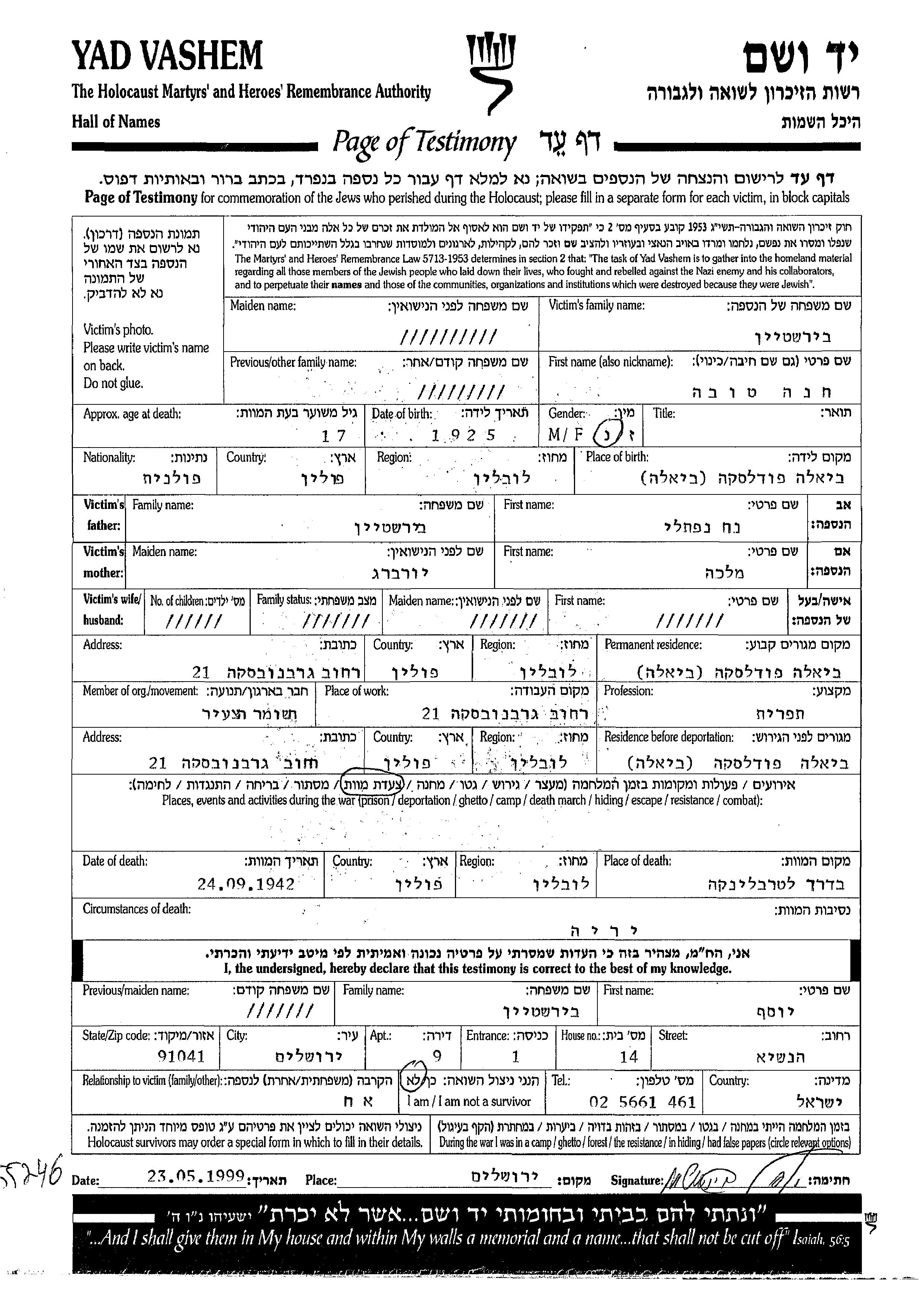 Birshtein Khana Tova 1925 Biala Podlaska, Pologne Feuille de témoignage