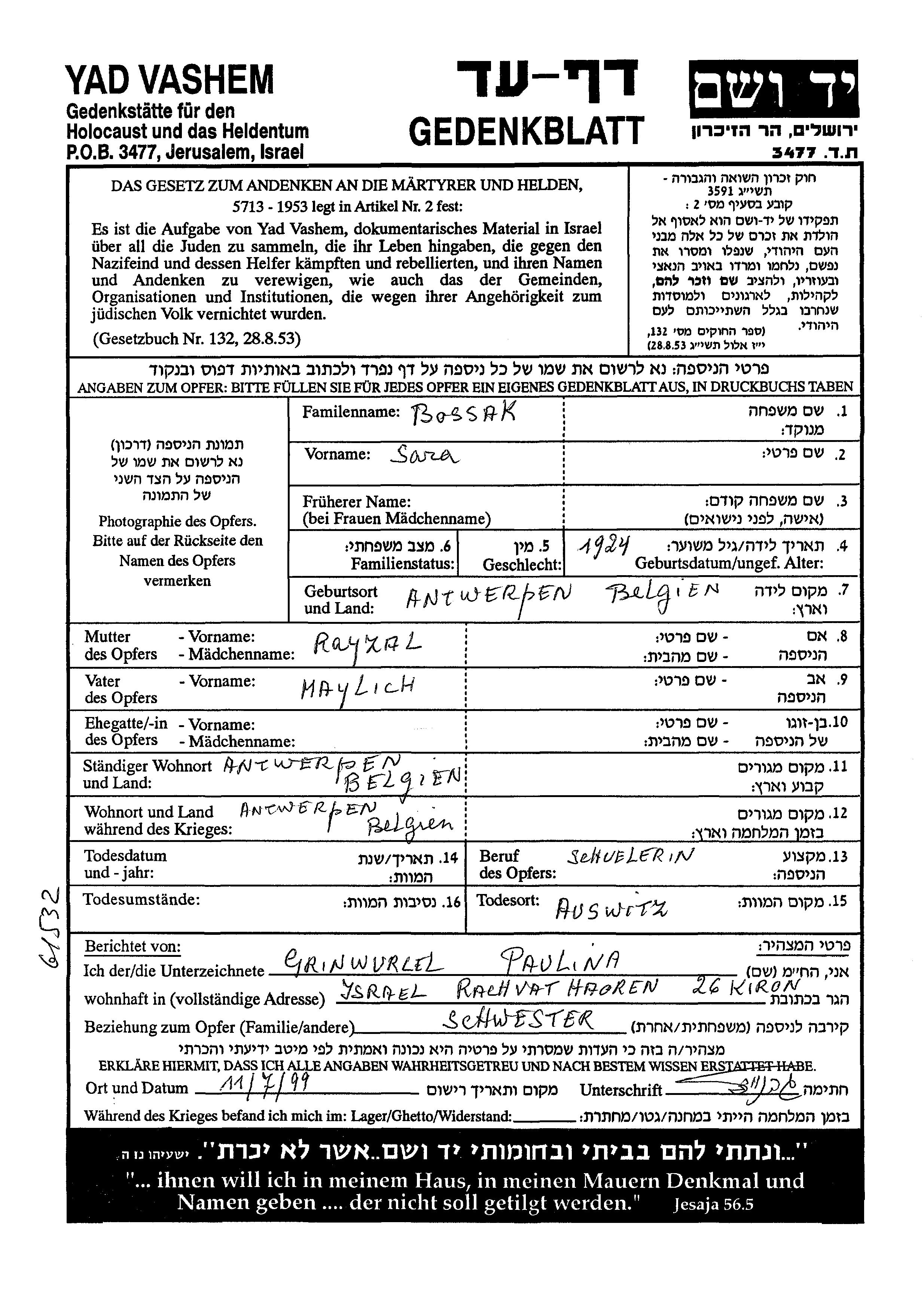 Bossak Sara 1924 Antwerpen, Belgique Feuille de témoignage