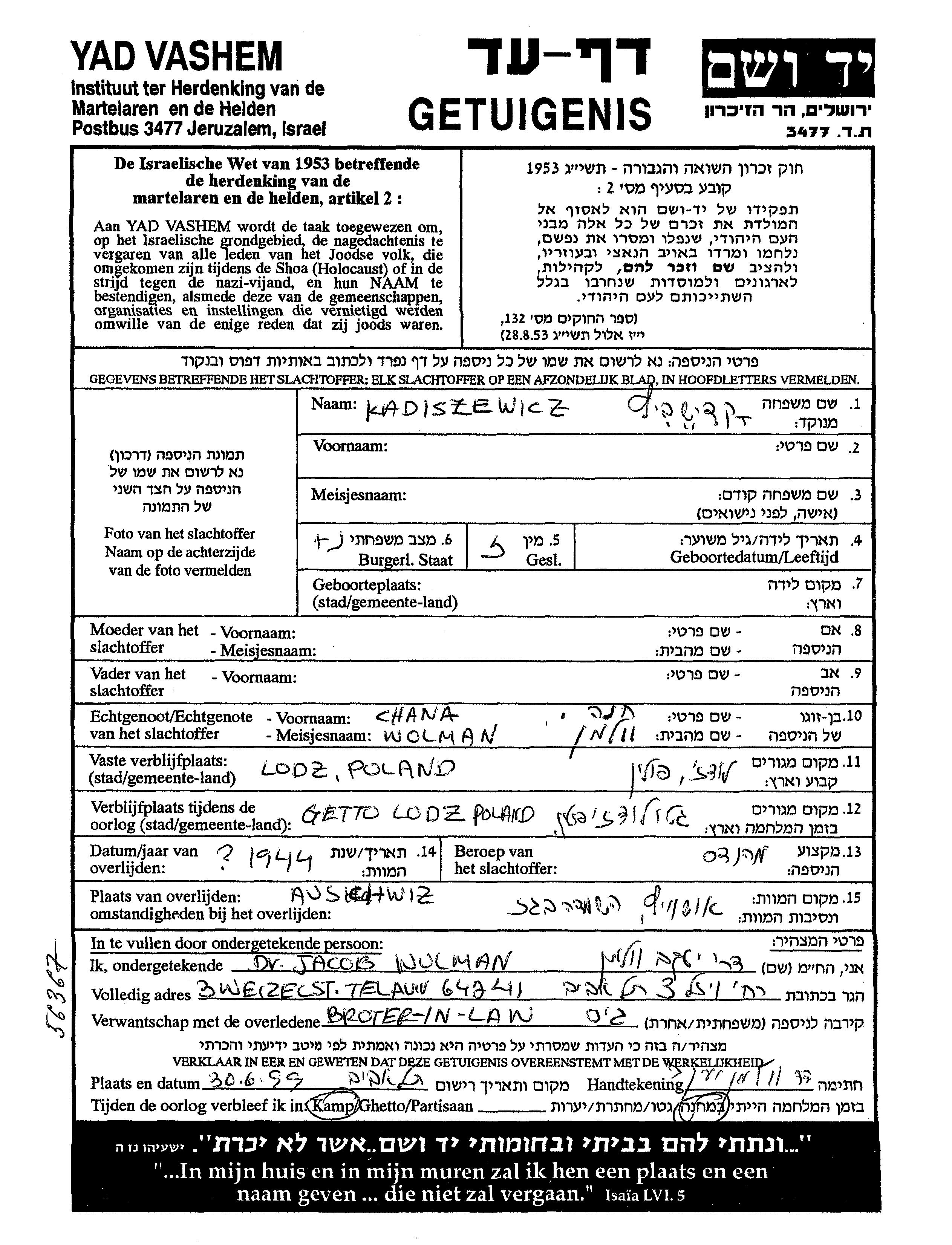 Kadiszewicz prénom inconnu Lodz, Pologne Feuille de témoignage