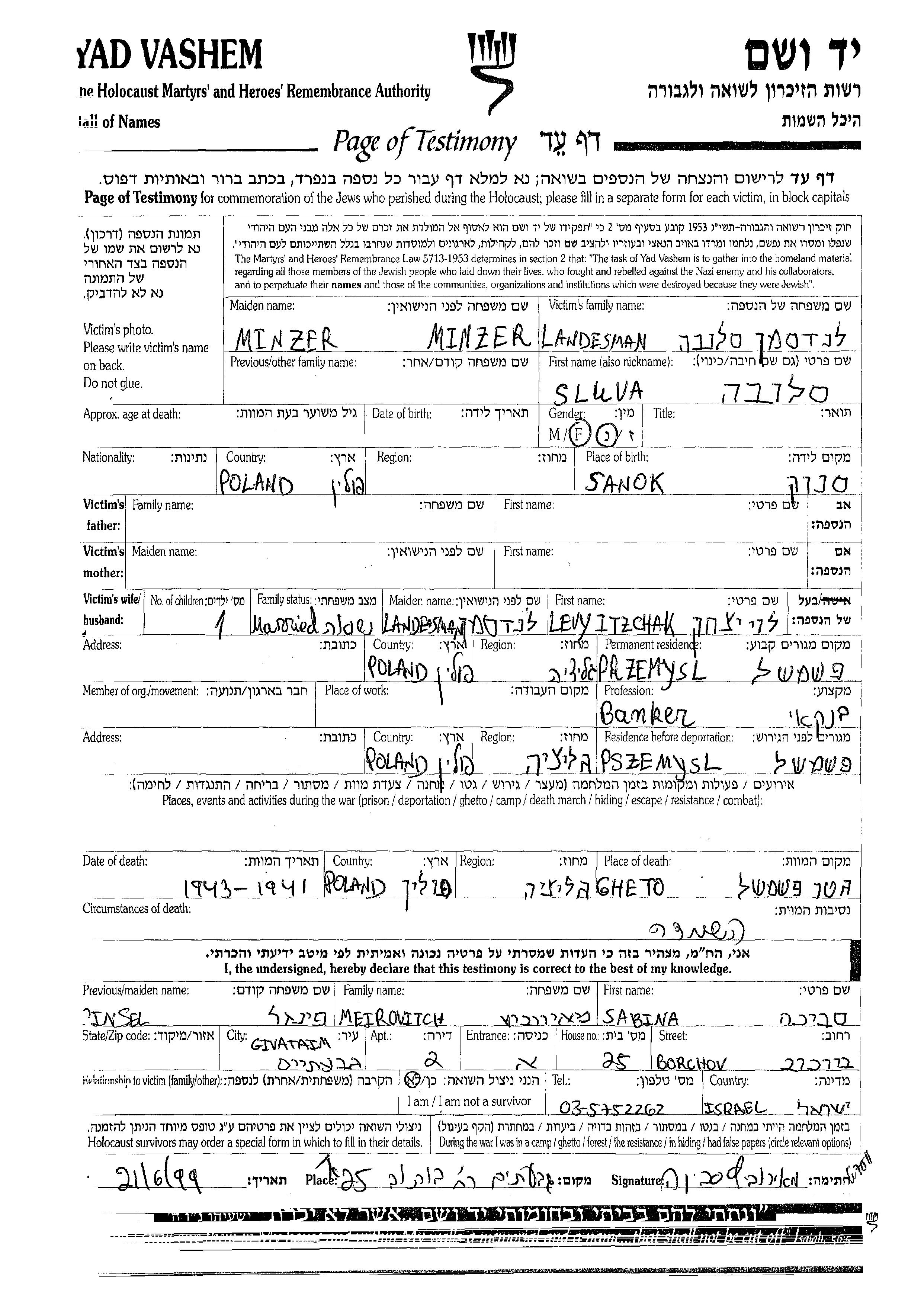 Landesman Sluva Przemysl, Pologne Feuille de témoignage