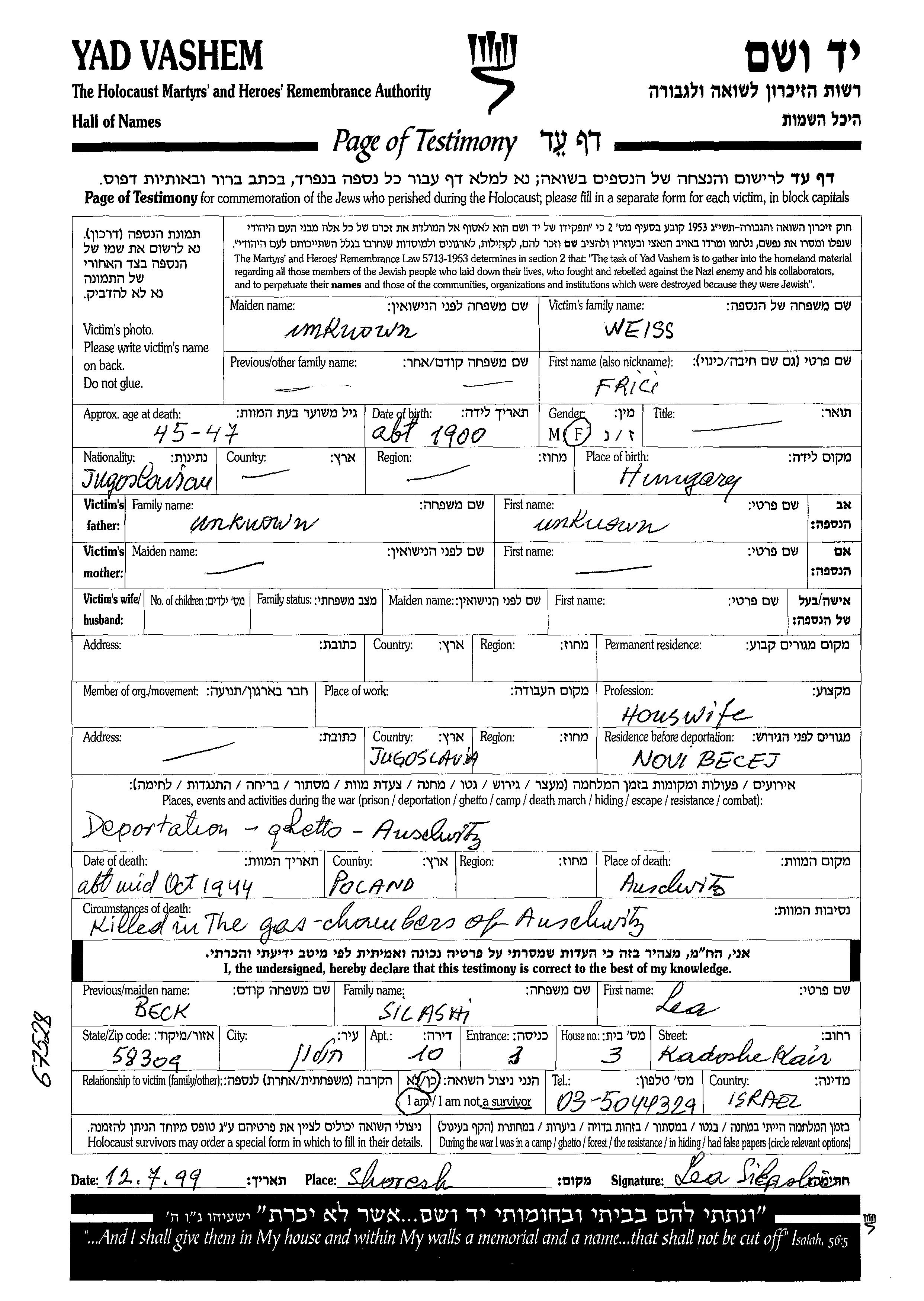 Weiss Frici 1900 endroit inconnu, Feuille de témoignage