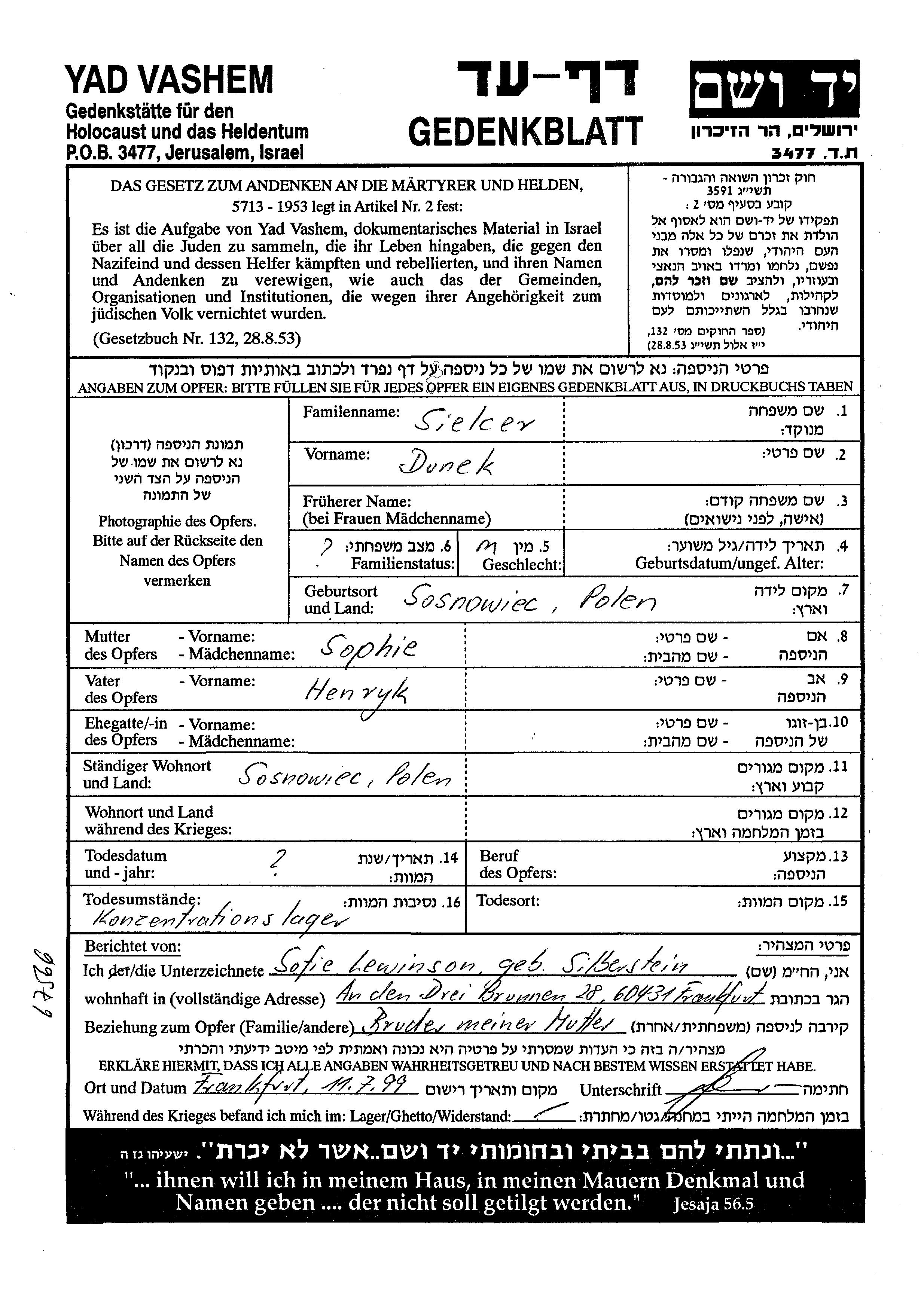 Dunek Sielcer est né à Sosnowiec, Pologne, fils de Henryk et de Sophie. Avant la seconde guerre mondiale il vivait à Sosnowiec, Pologne.