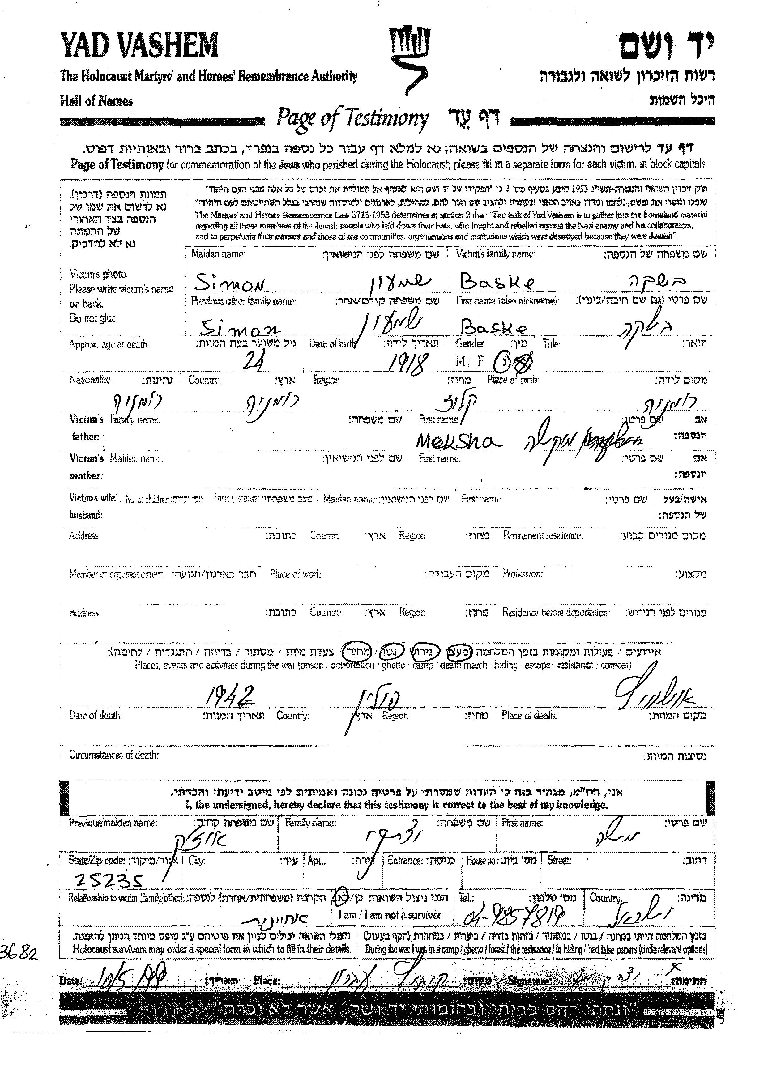 Simon Shimon Baske 1918 endroit inconnu, Feuille de témoignage