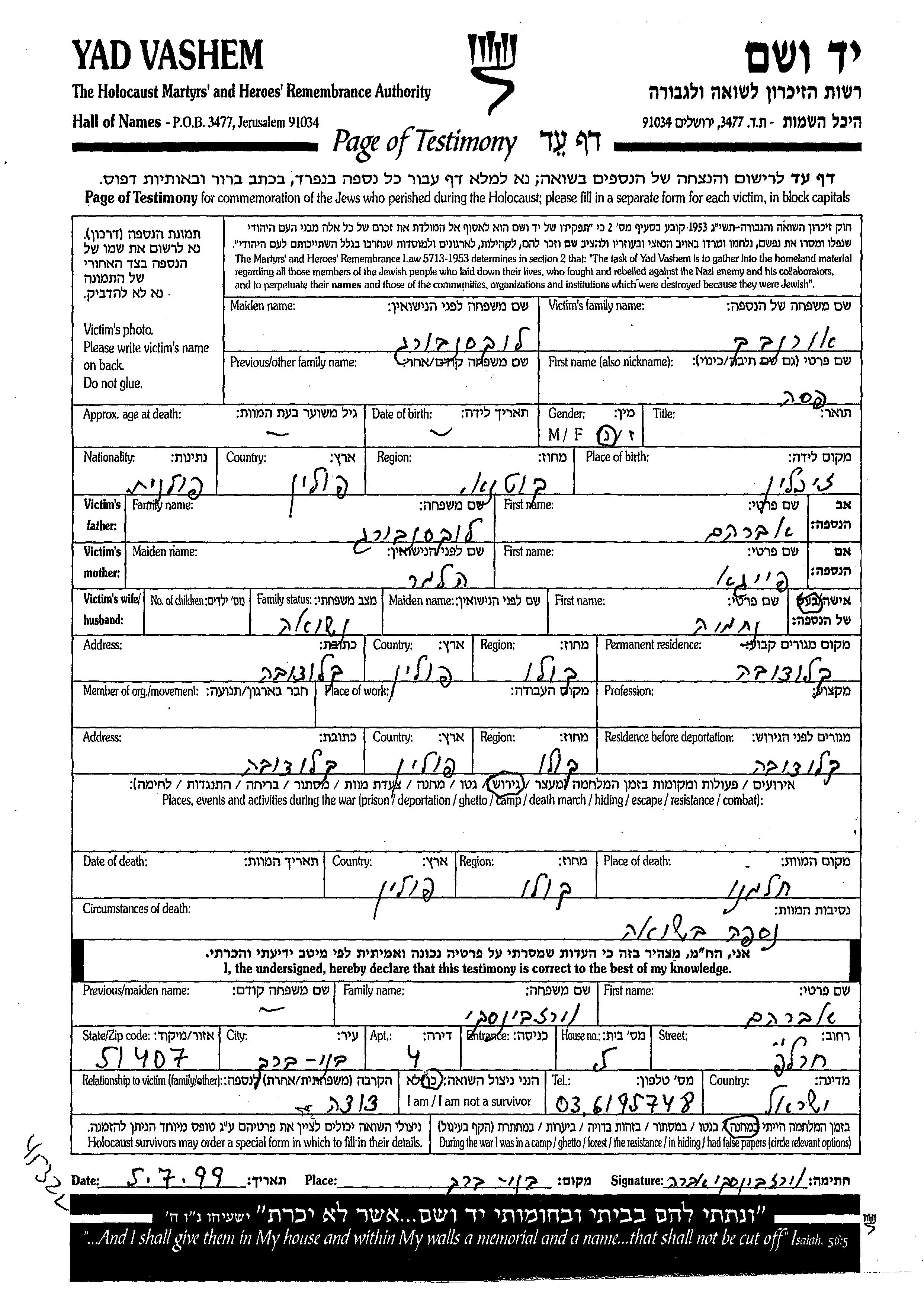 Yad Vashem - Pages of Testimony Names Memorial Collection