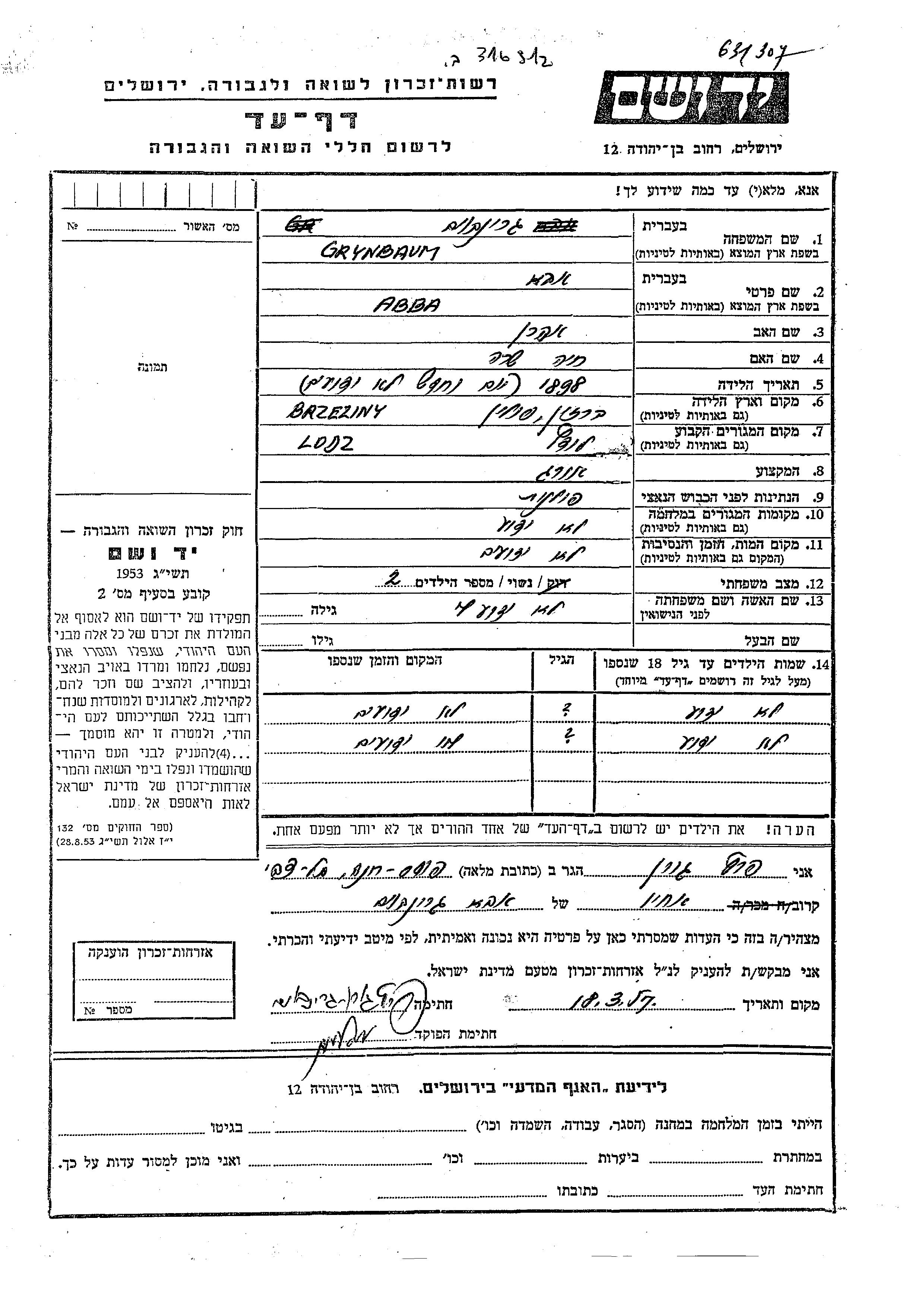 Grynbaum Aba 1898 Lodz, Pologne Feuille de témoignage