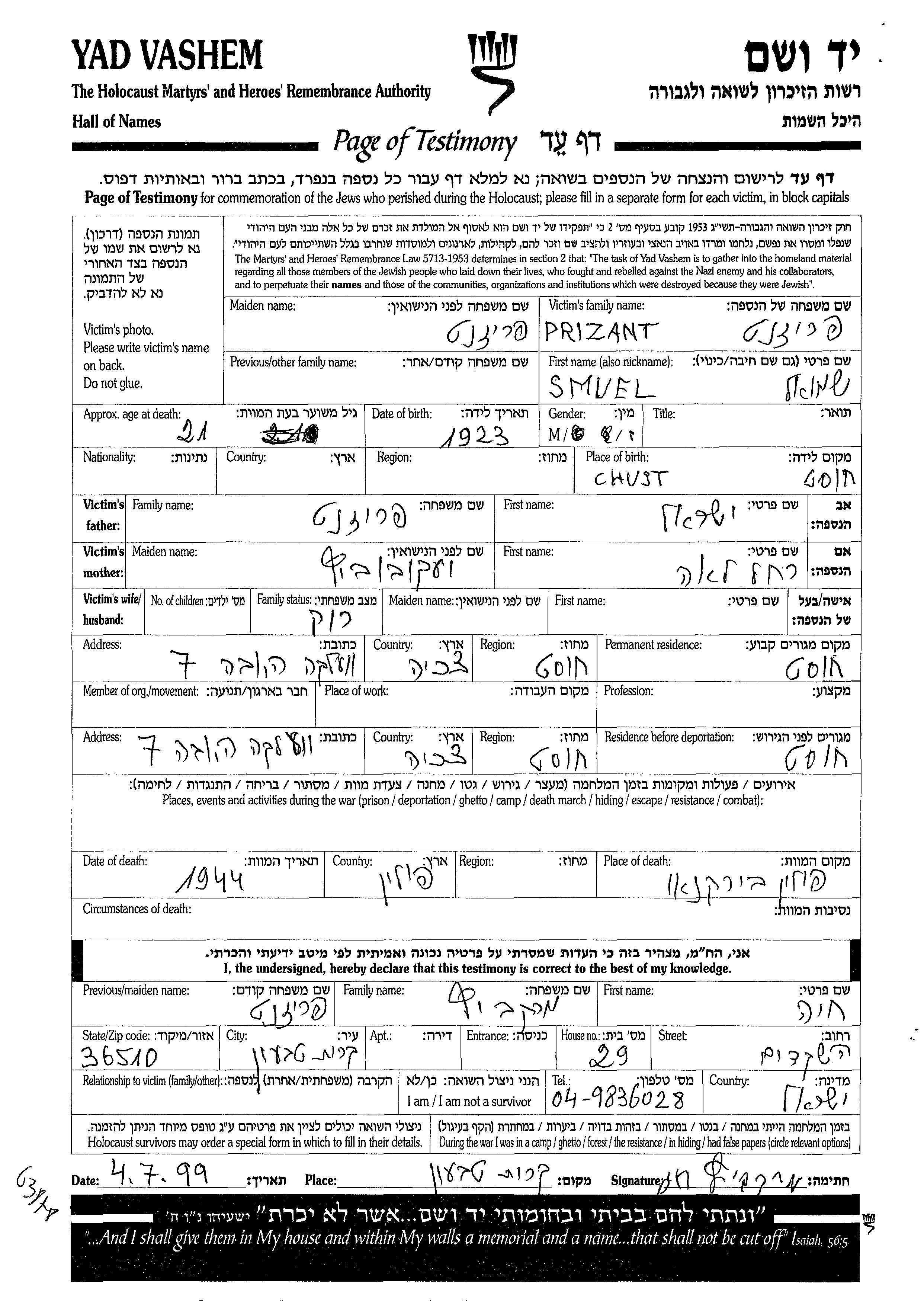 Prizant Smuel 1923 Chust, Tchécoslovaquie Feuille de témoignage