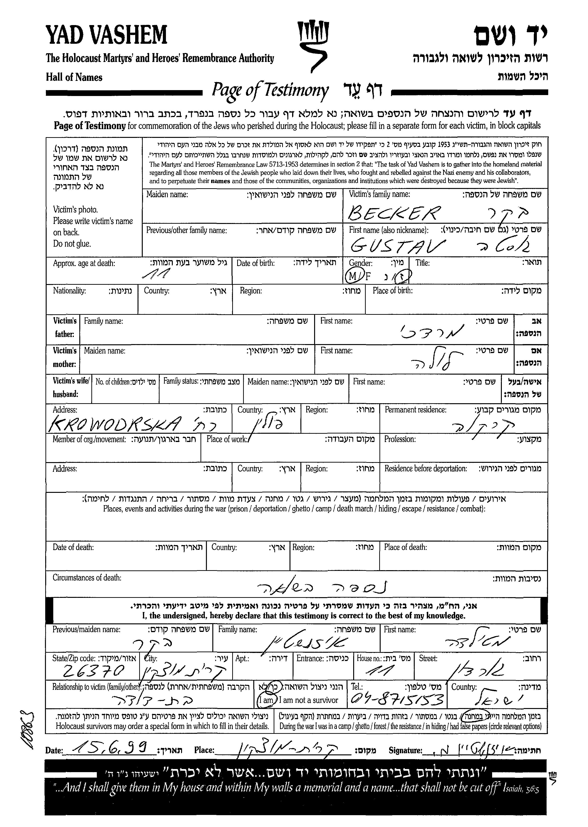 Becker Gustav Krakow, Pologne Feuille de témoignage