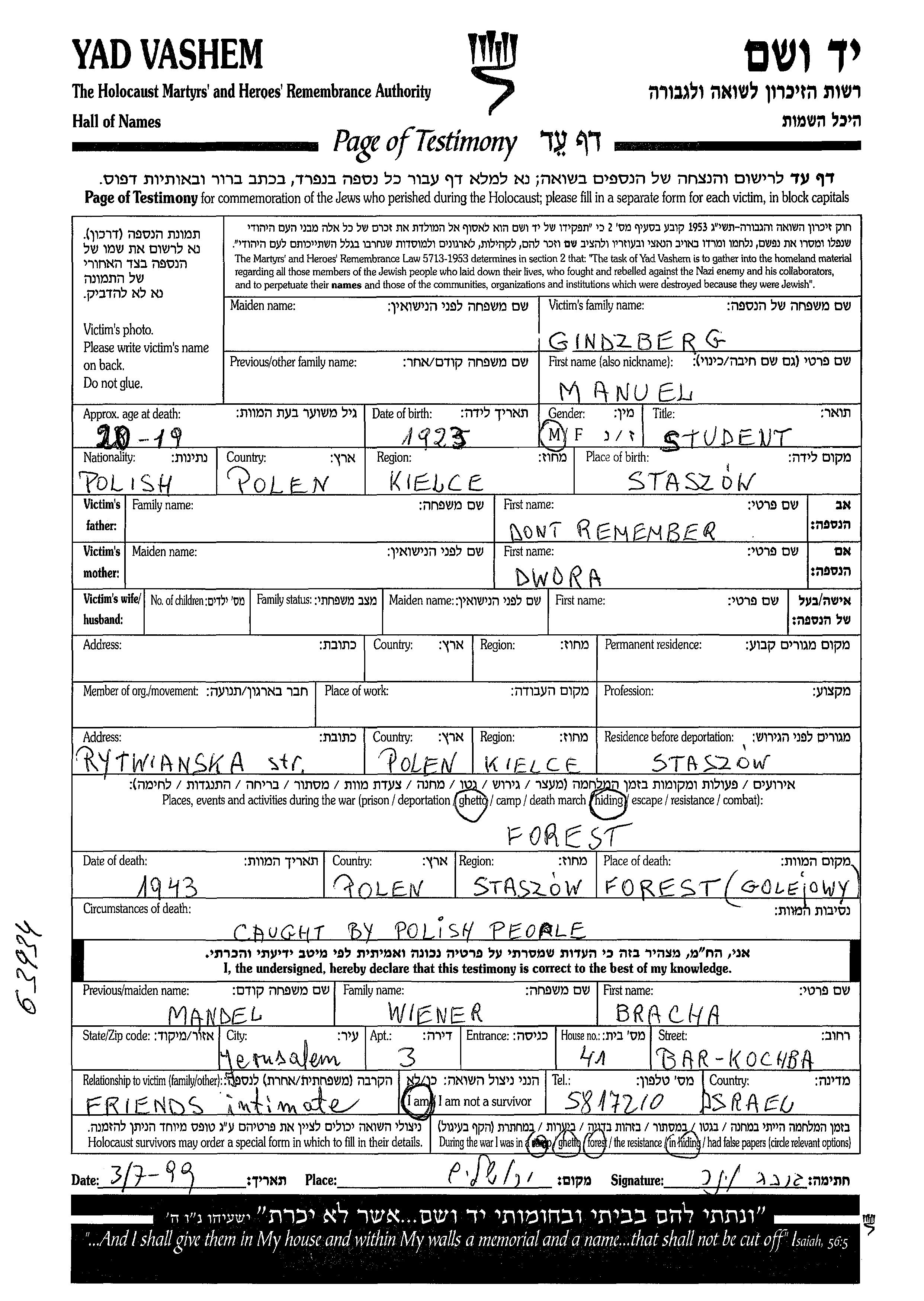 Gindzberg Emanuel 1923 endroit inconnu, Feuille de témoignage