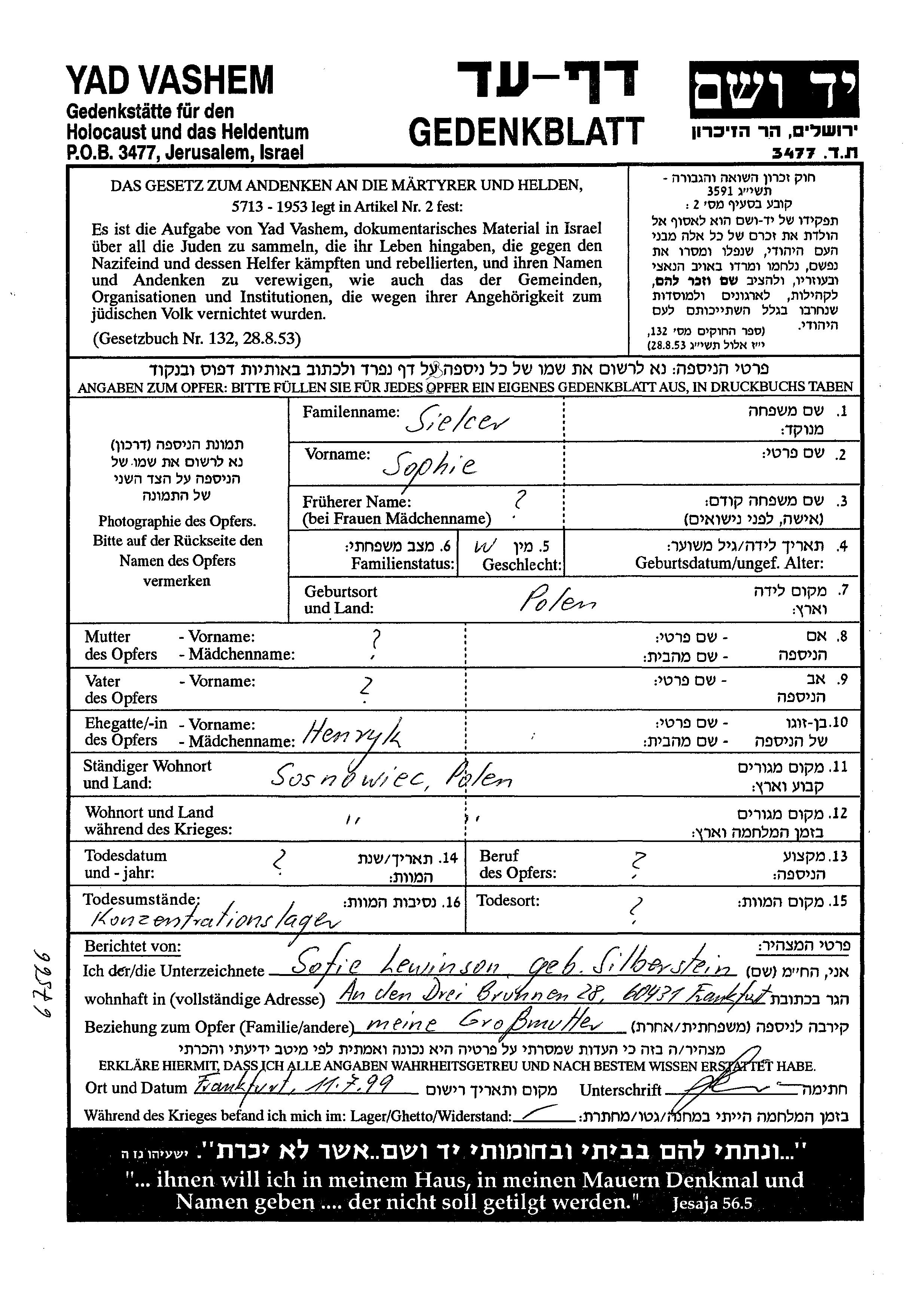 Sielcer Sophie Sosnowiec, Pologne Feuille de témoignage