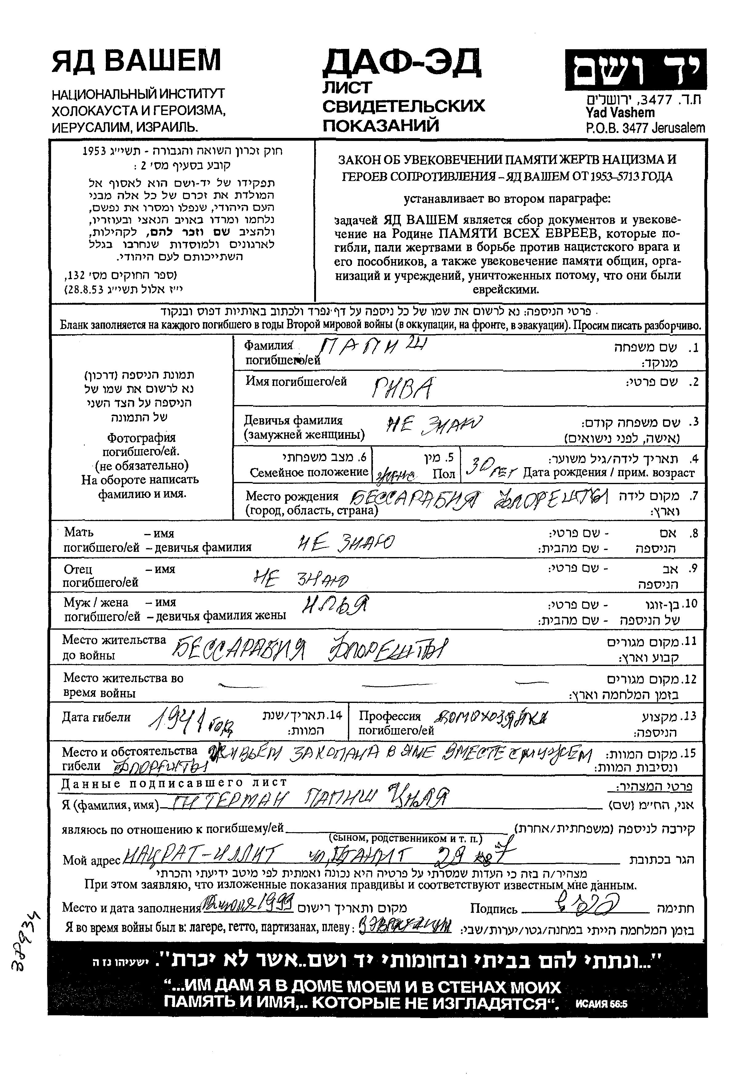 Yad Vashem - Pages of Testimony Names Memorial Collection