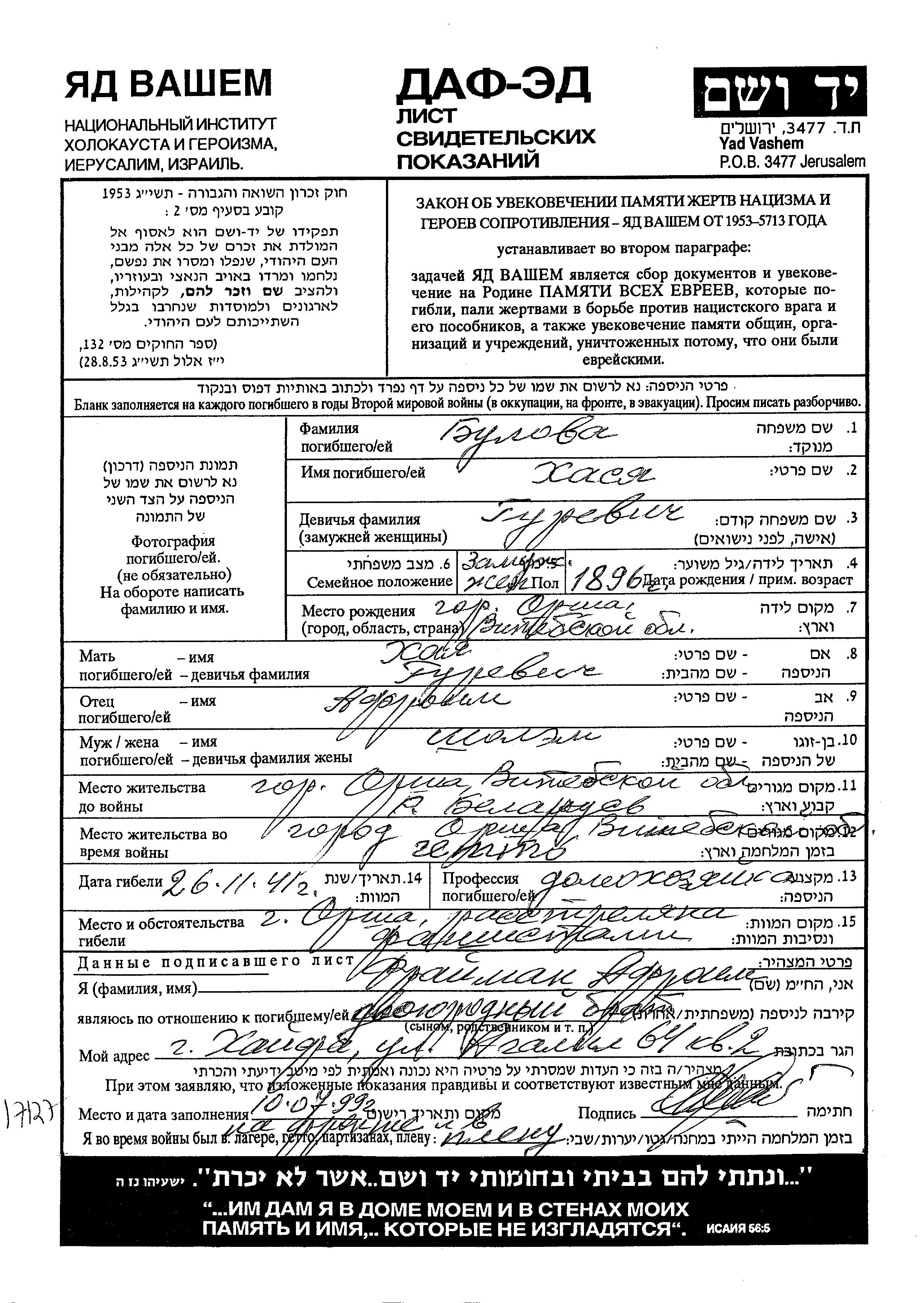 Bulov Khasya 1896 Orsha, Bélorussie (URSS) Feuille de témoignage