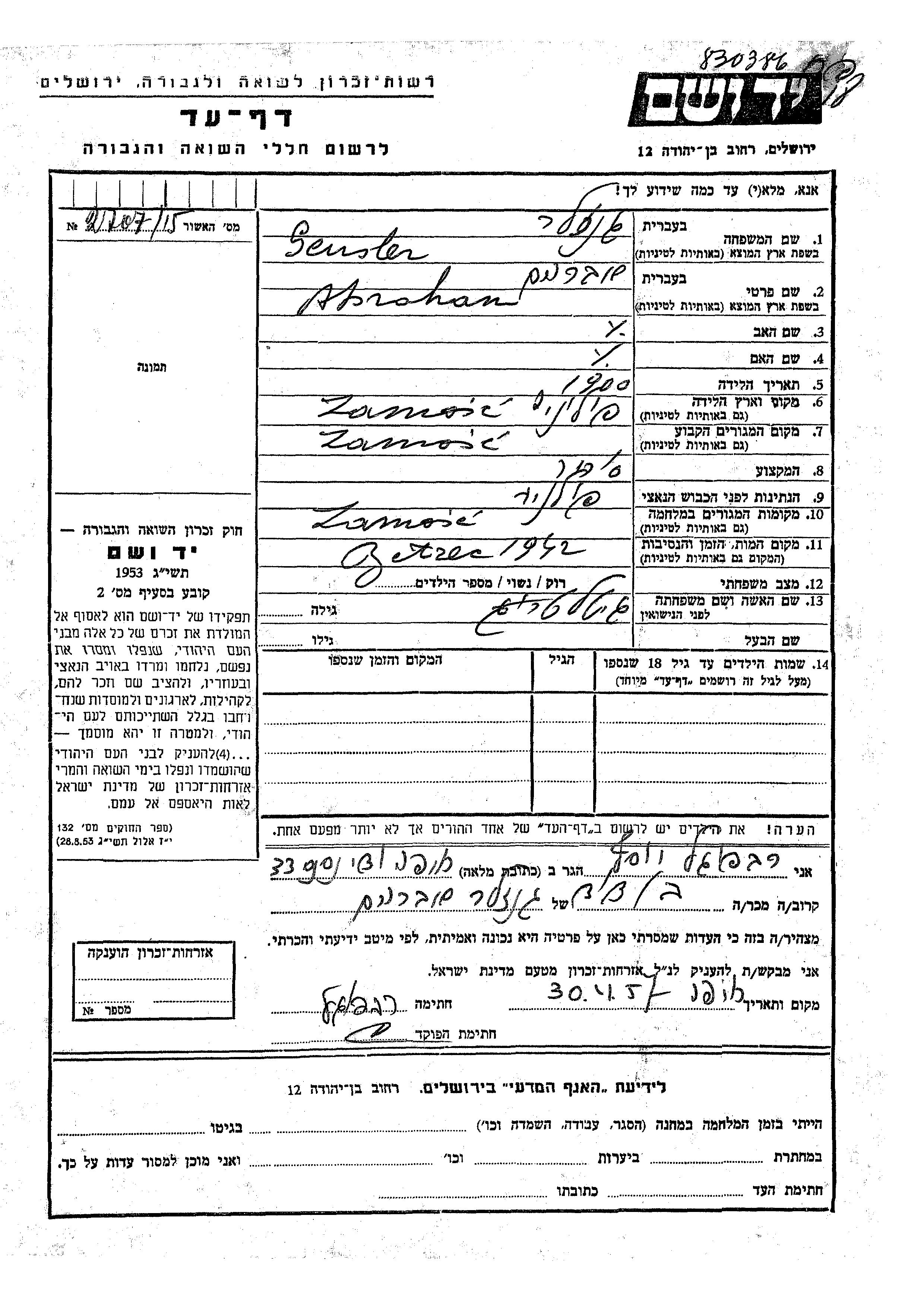 Gensler Abraham 1900 Zamosc, Pologne Feuille de témoignage