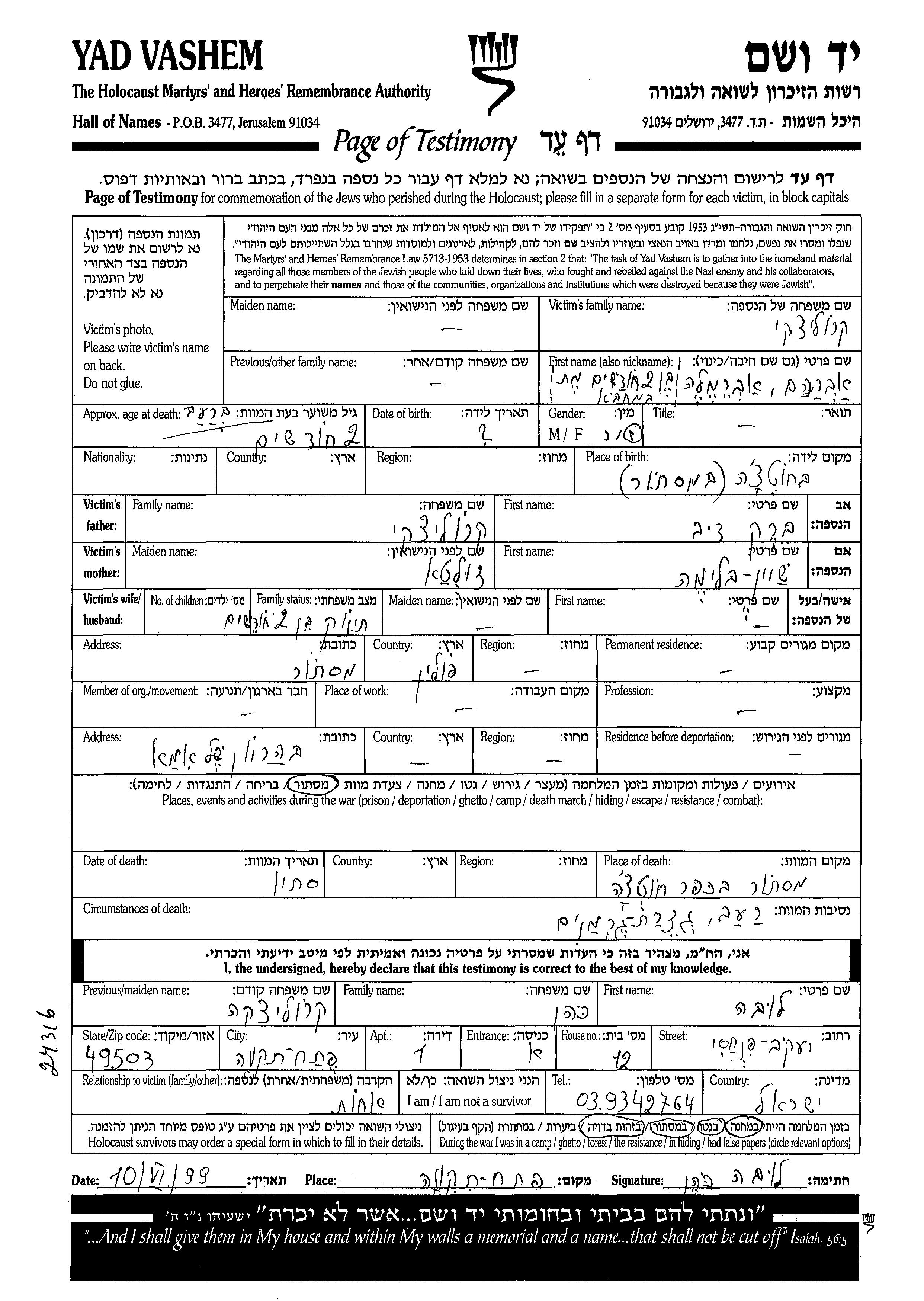 Yad Vashem - Pages of Testimony Names Memorial Collection