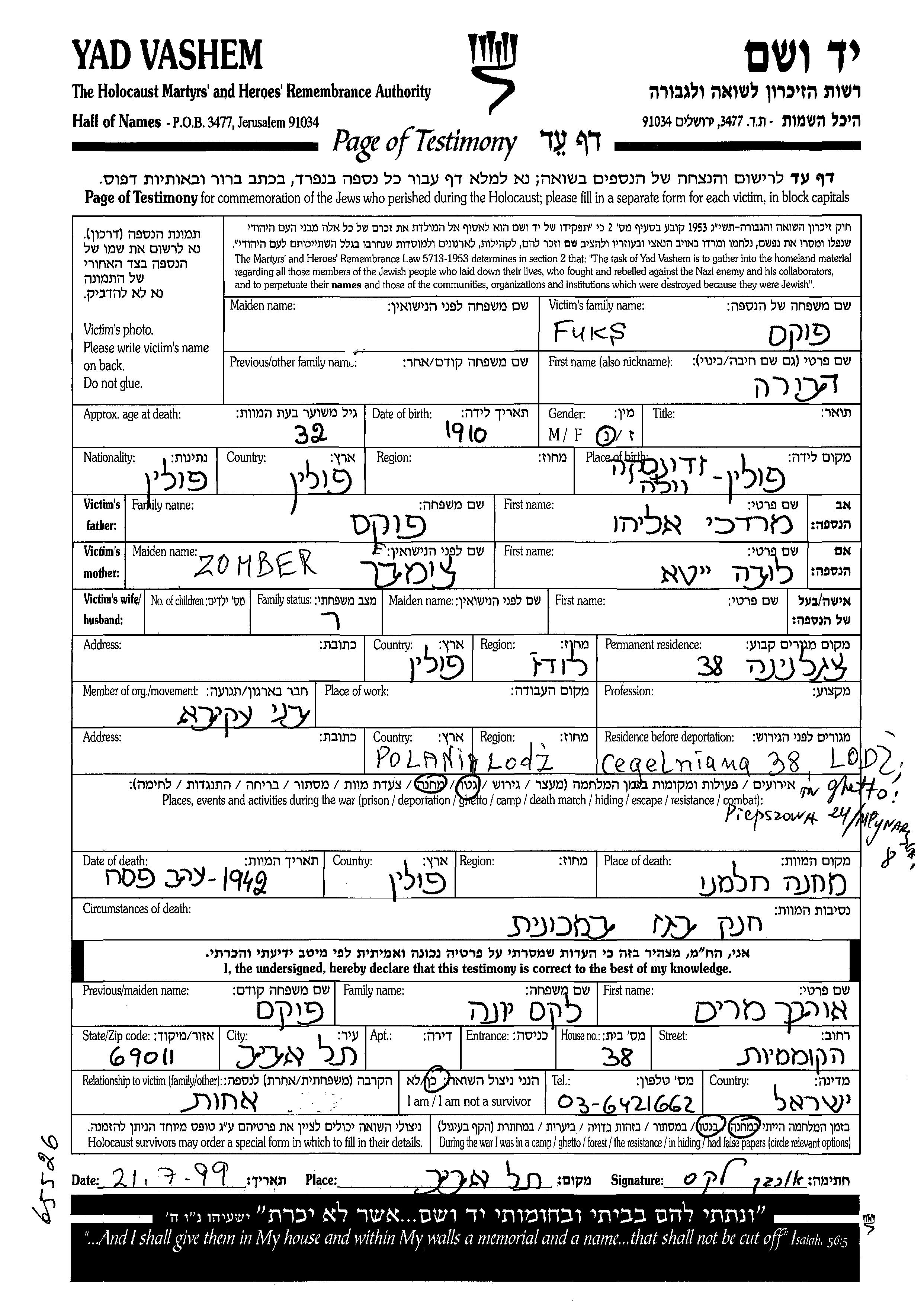 Fuks Dvora 1910 Lodz, Pologne Feuille de témoignage