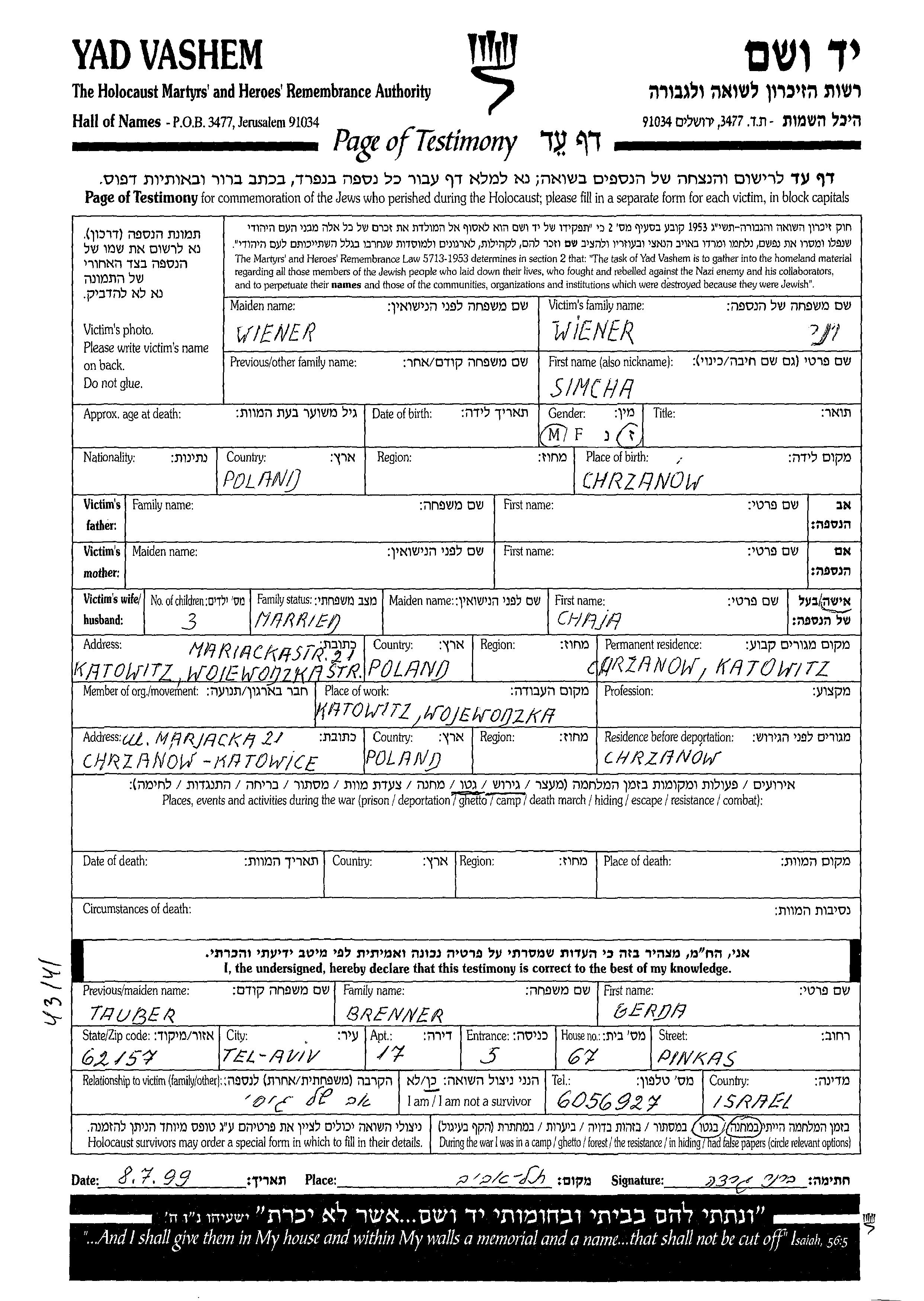 Wiener Simcha Katowice, Pologne Feuille de témoignage