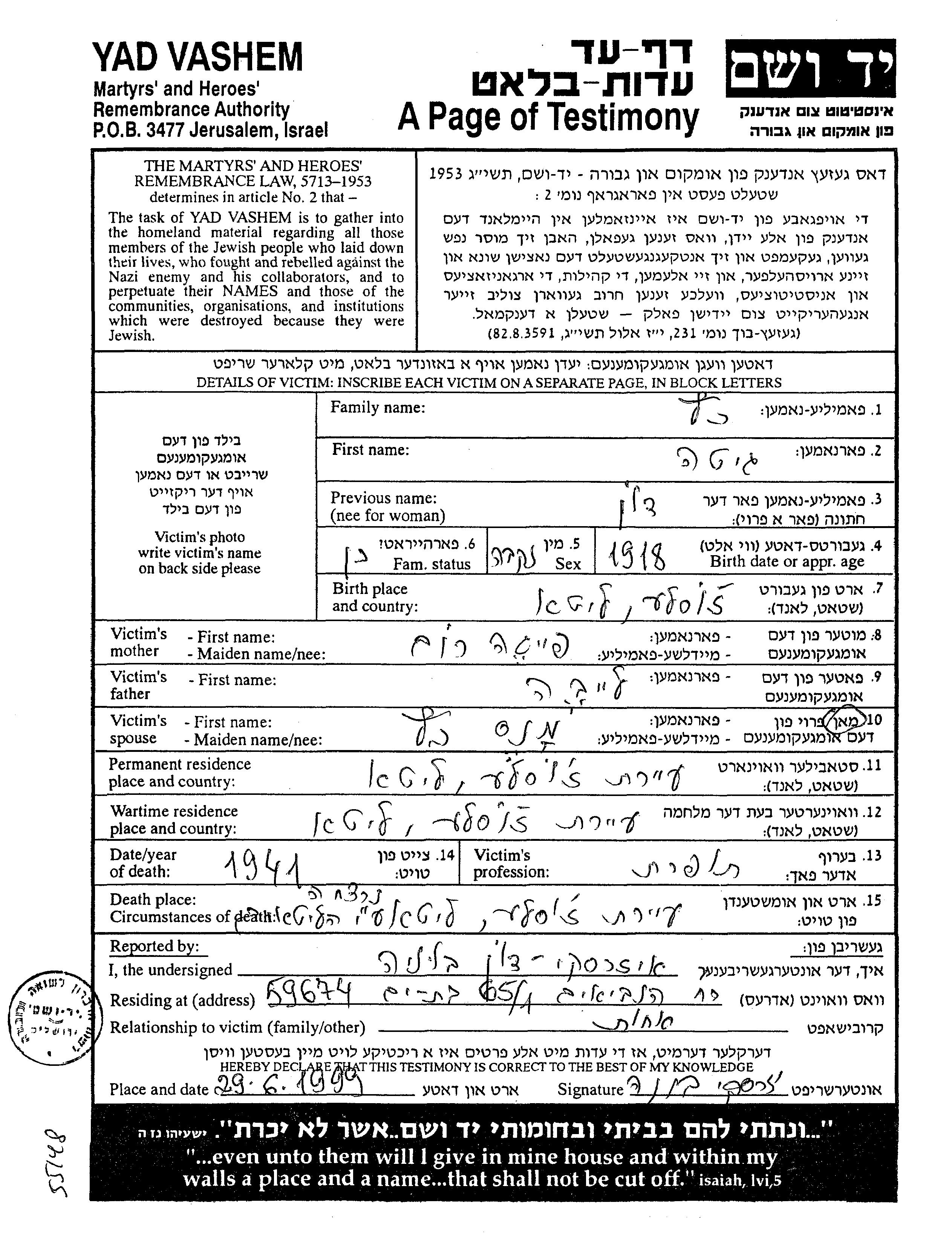 Yad Vashem - Pages of Testimony Names Memorial Collection