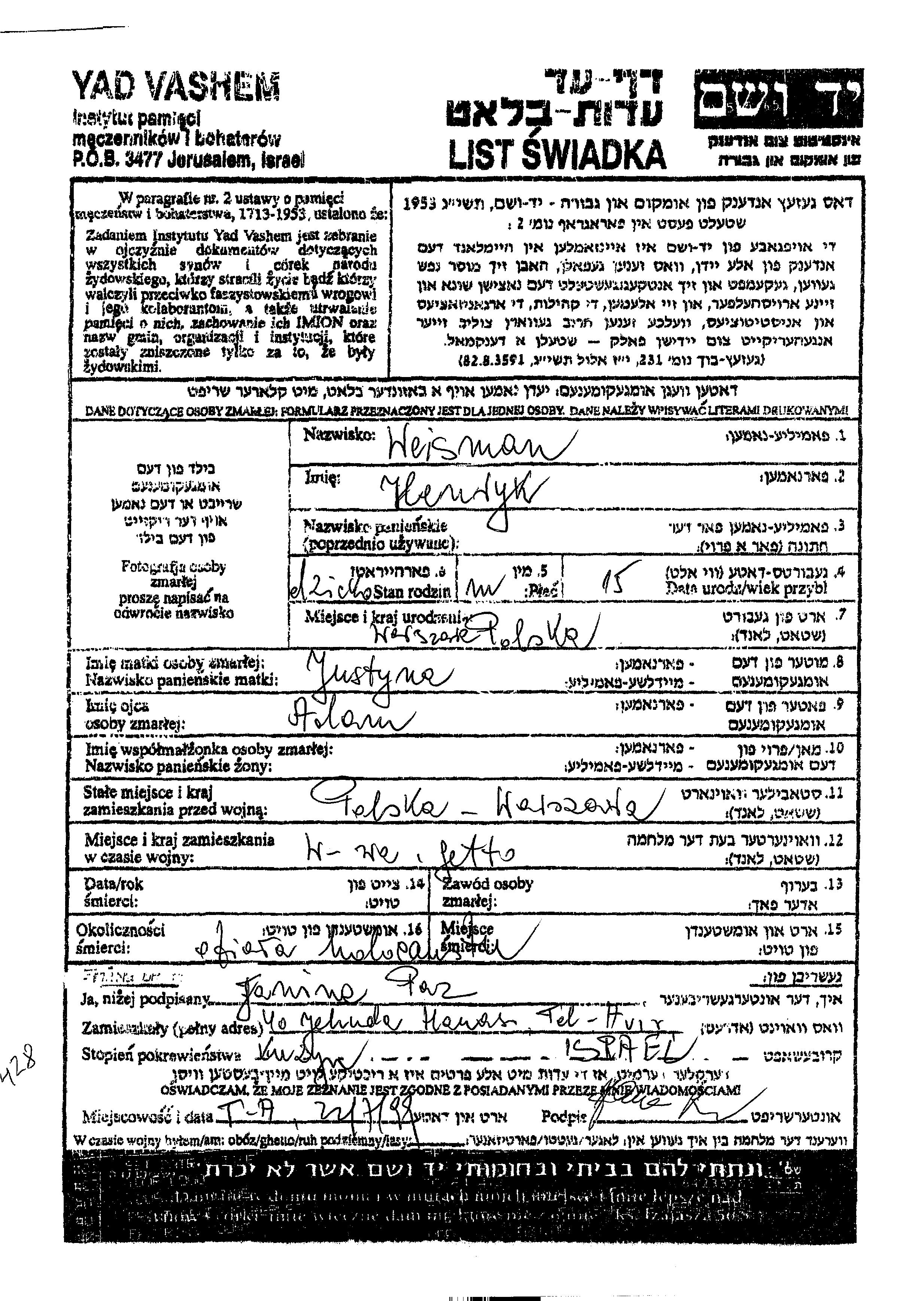 Weisman Henryk Warszawa, Pologne Feuille de témoignage