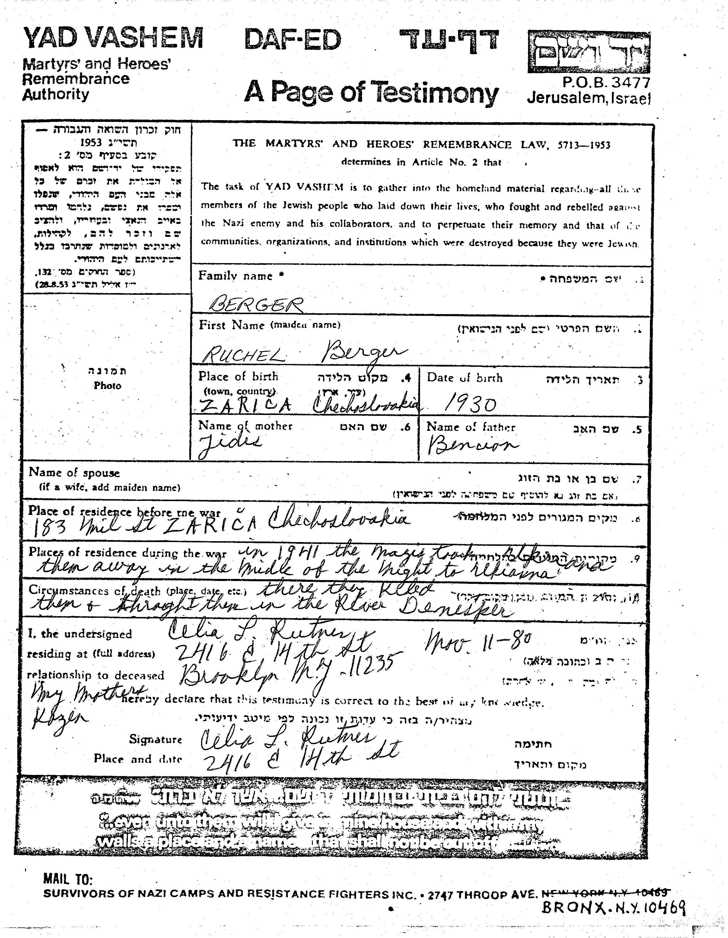 Ruchel Berger est née à Zarica, Tchécoslovaquie en 1930, fille de Bencion et de Yidel. Avant la seconde guerre mondiale elle vivait à Zarica, Tchécoslovaquie. Pendant la guerre, elle était à Ukraine (URSS).