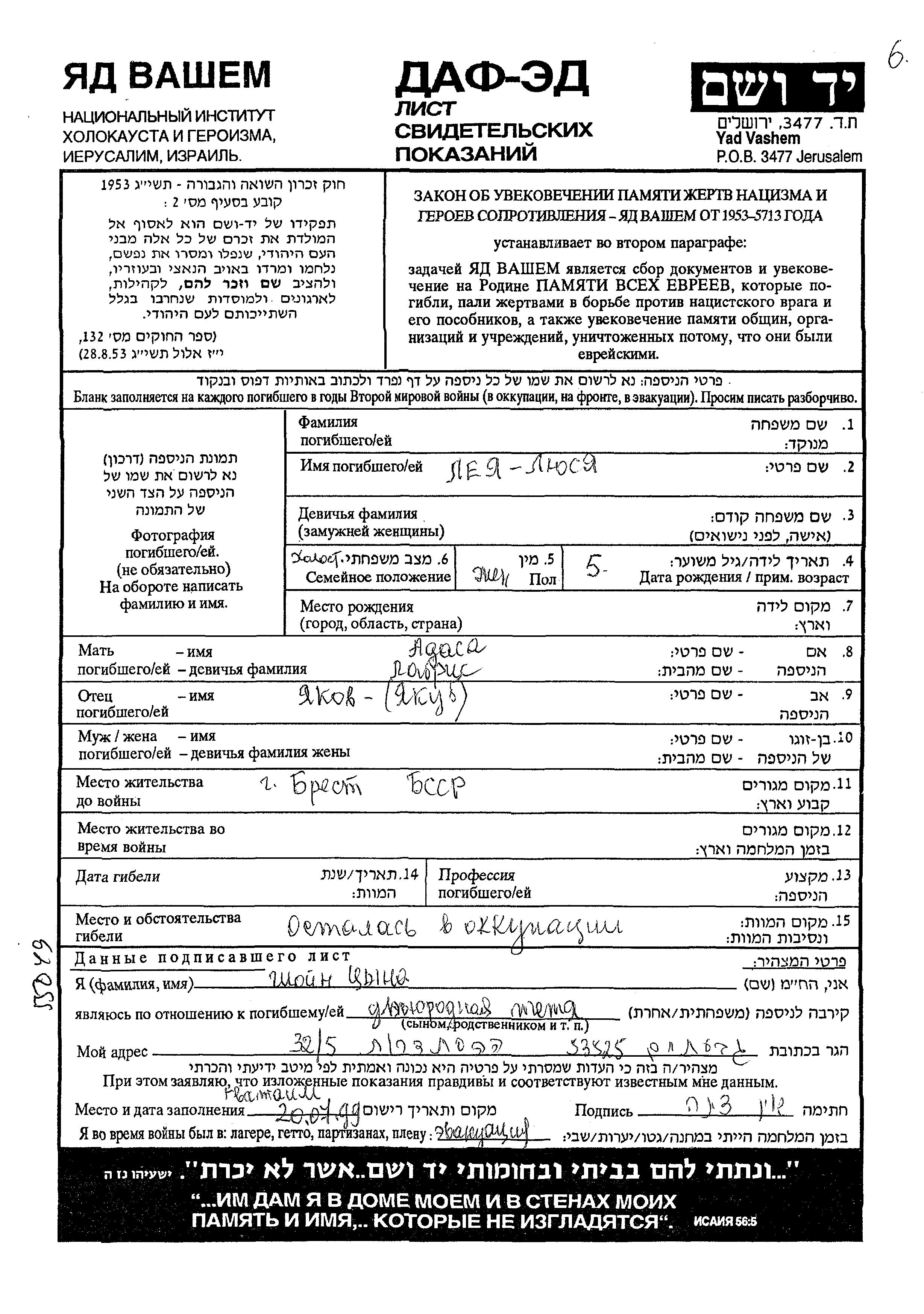 Yad Vashem - Pages of Testimony Names Memorial Collection