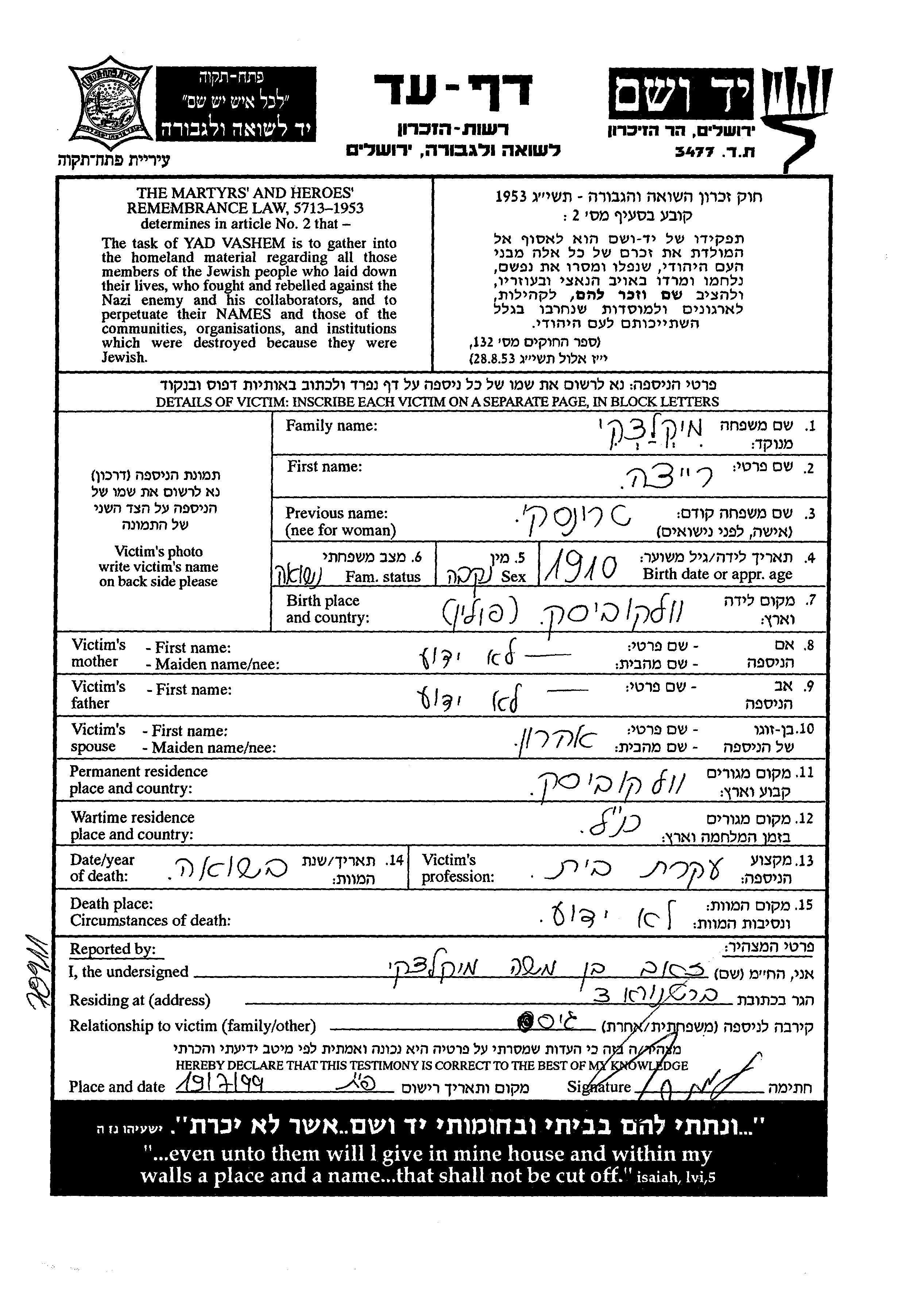 Yad Vashem - Pages of Testimony Names Memorial Collection