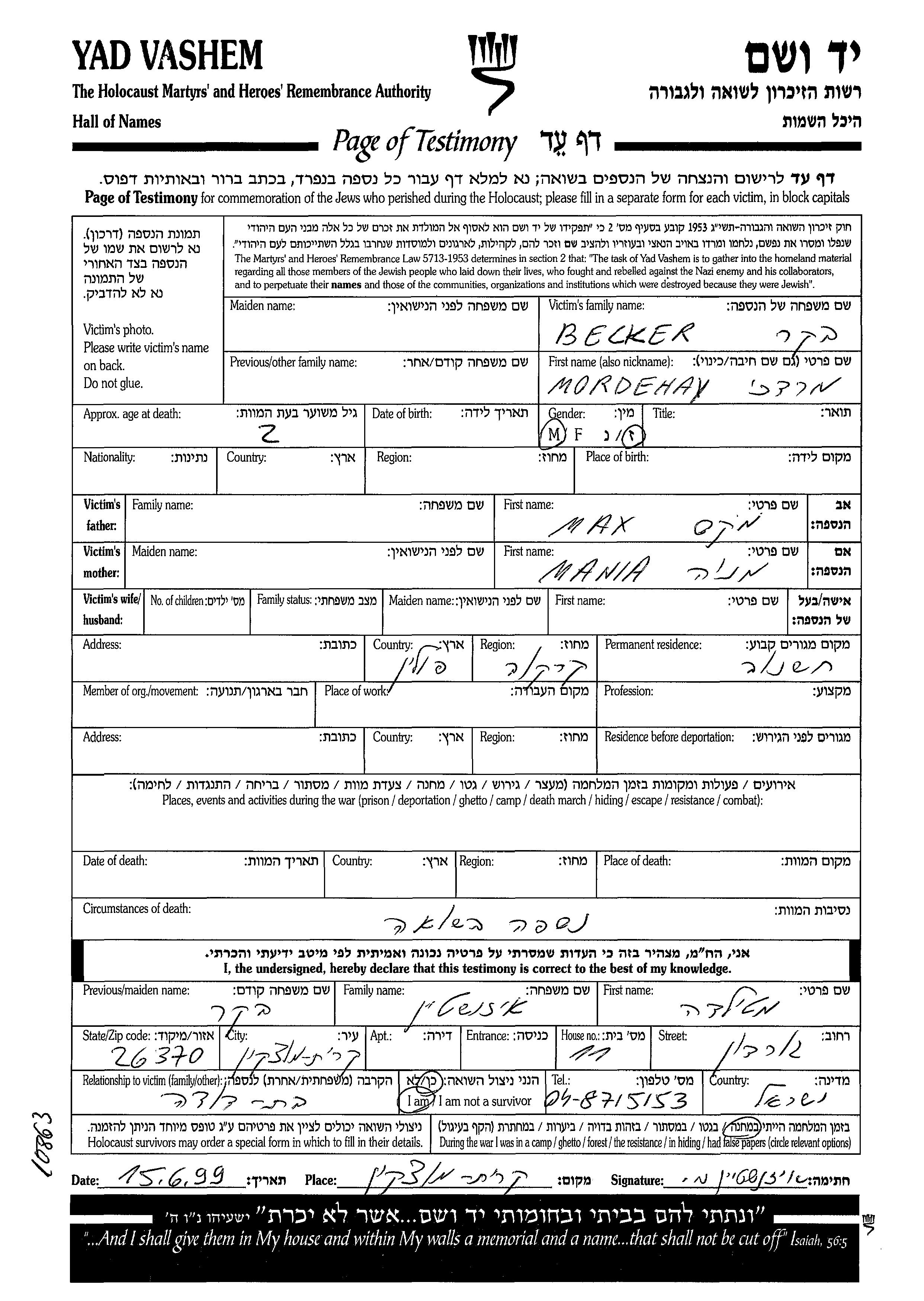 Becker Mordehay Chrzanow, Pologne Feuille de témoignage