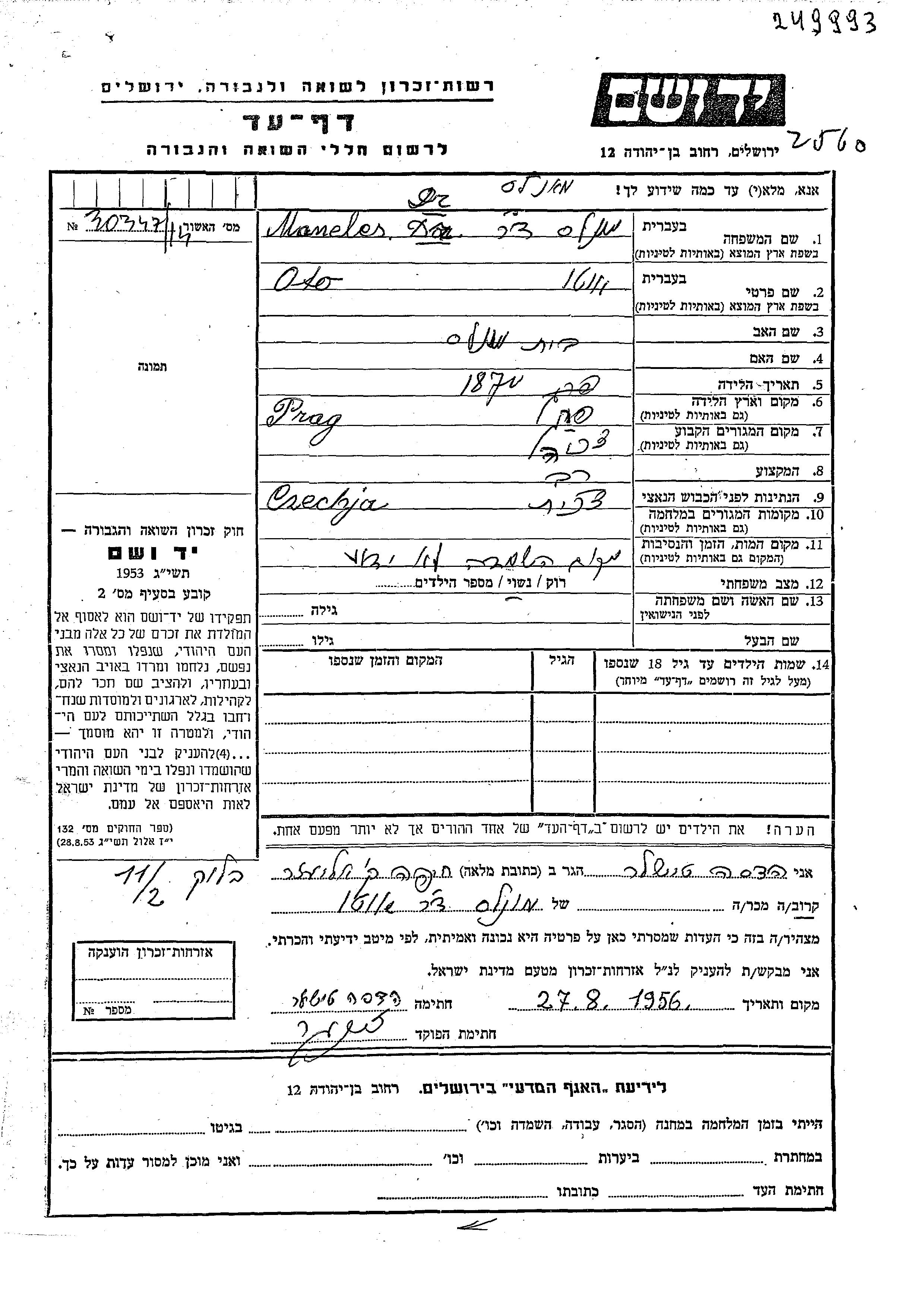 Dr. Oto Maneles est né à Prag, Tchécoslovaquie en 1870. Il était Rabbin et Marié. Avant la seconde guerre mondiale il vivait à Tchécoslovaquie.