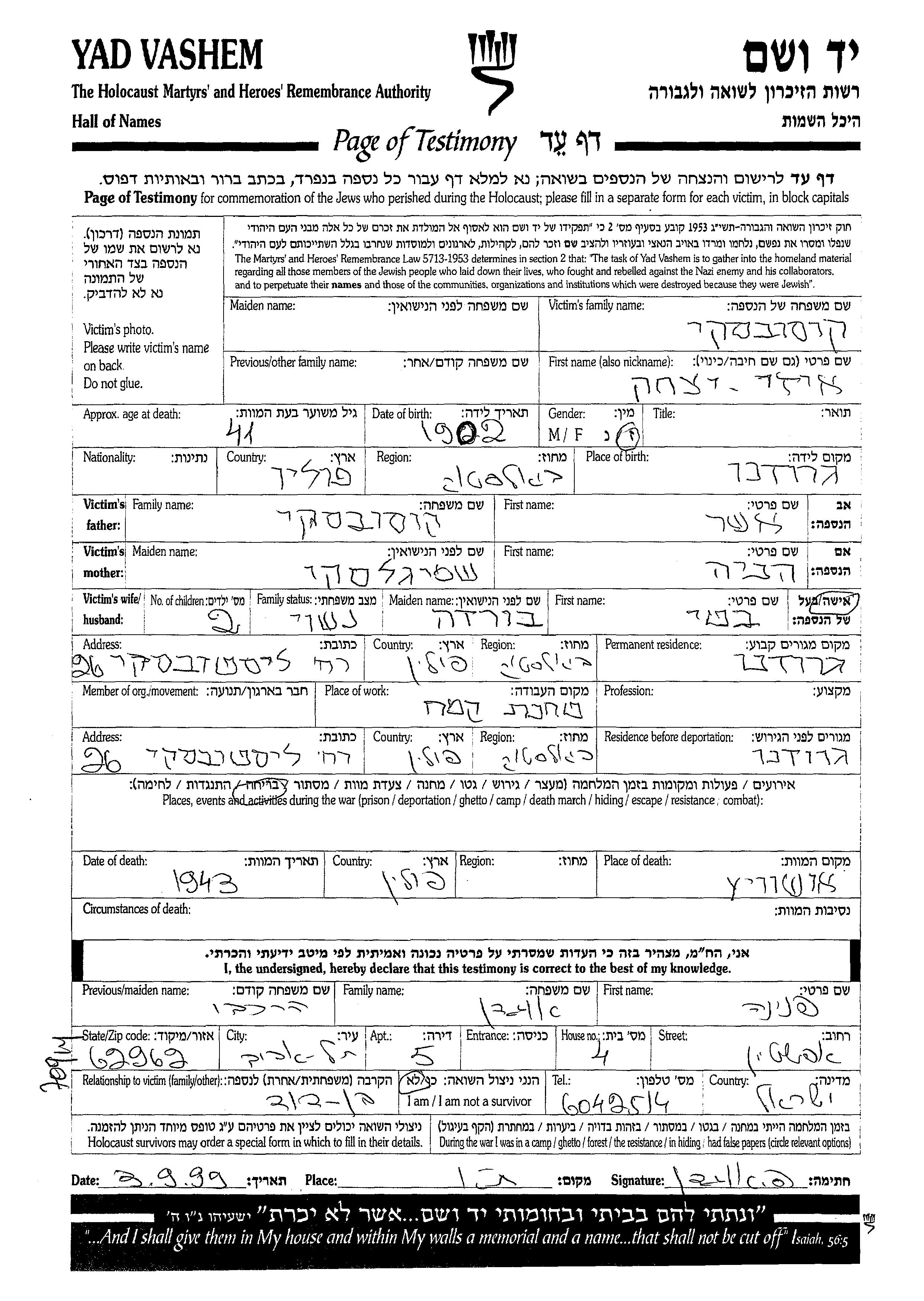 Yad Vashem - Pages of Testimony Names Memorial Collection