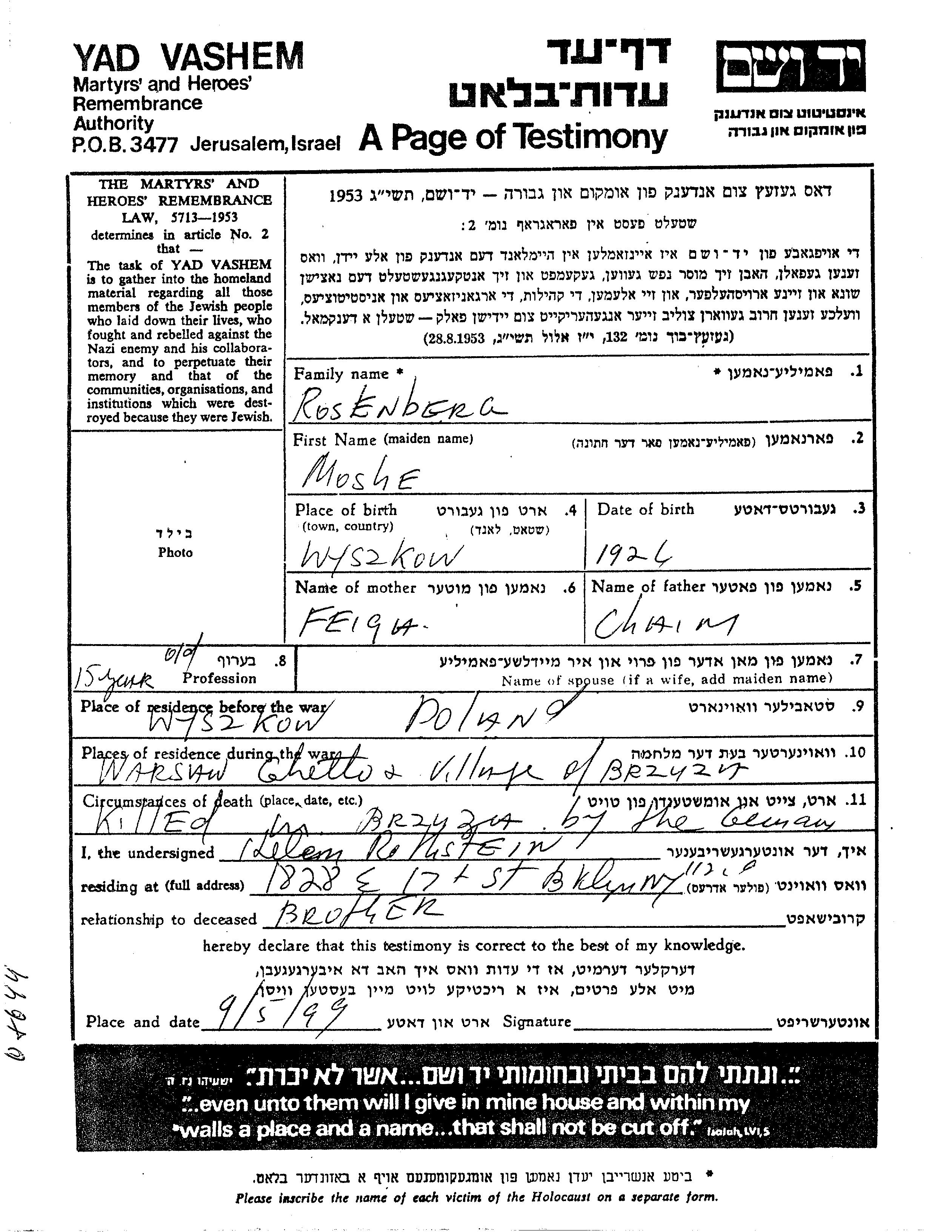 Rosenberg Moshe 1924 Wyszkow, Pologne Feuille de témoignage