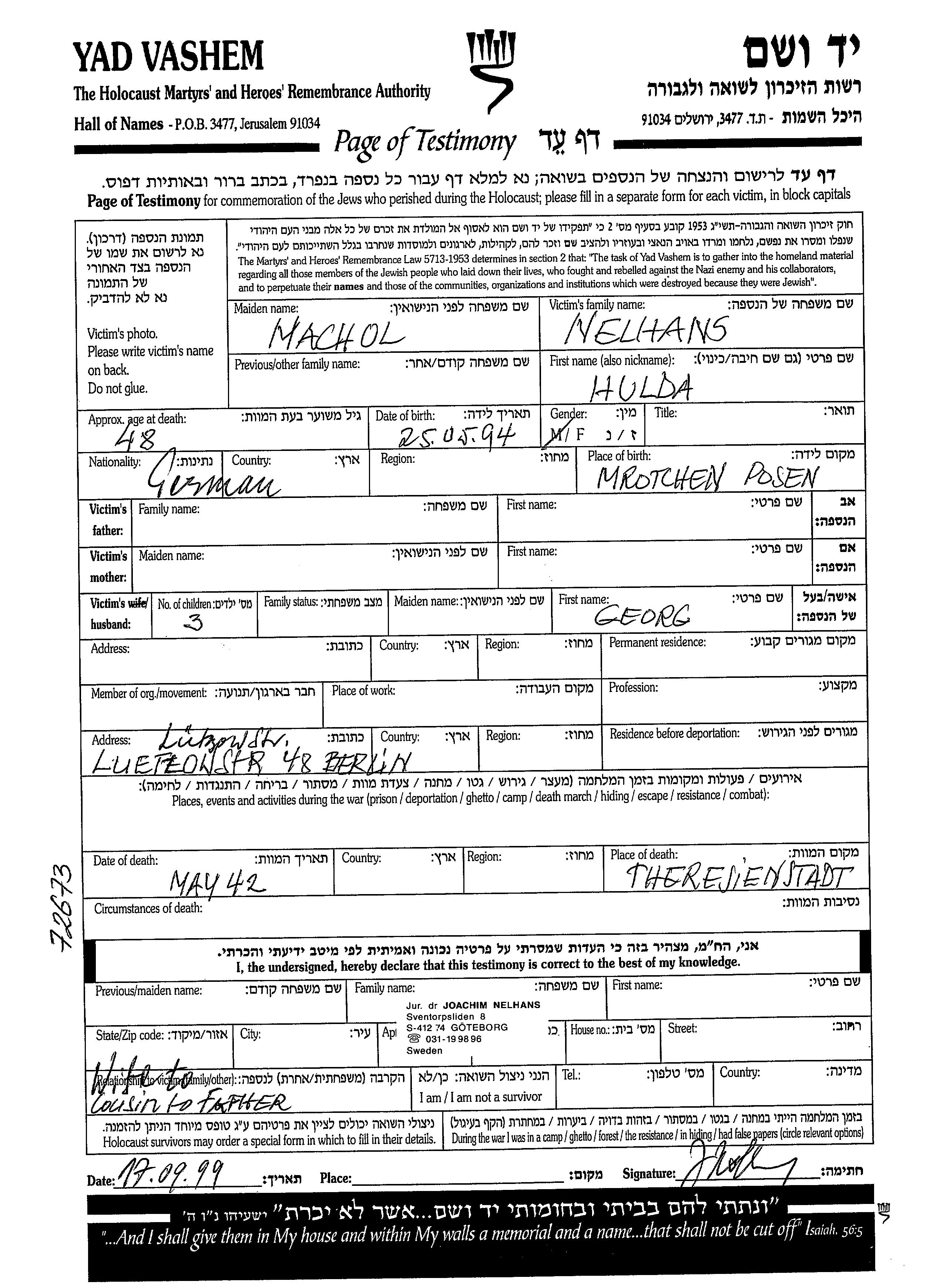 Yad Vashem - Pages of Testimony Names Memorial Collection