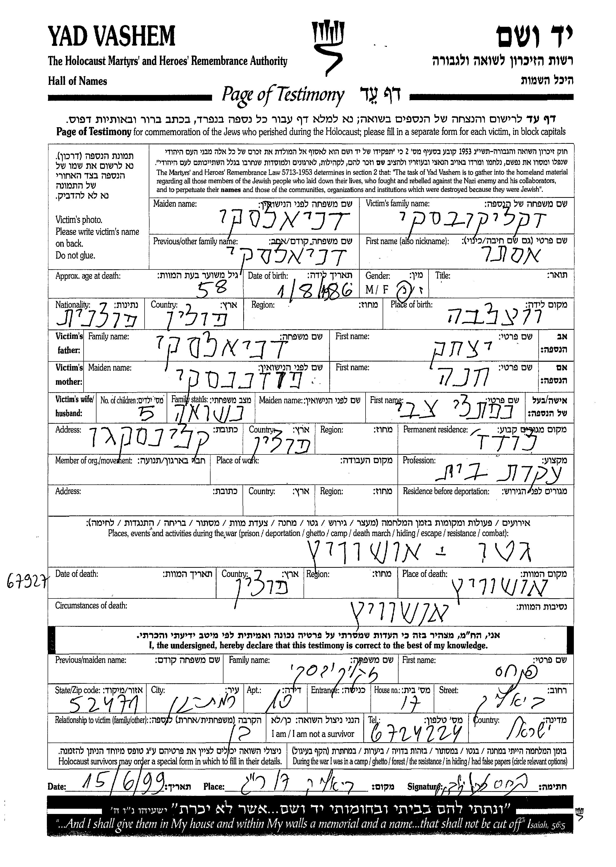 Yad Vashem - Pages of Testimony Names Memorial Collection