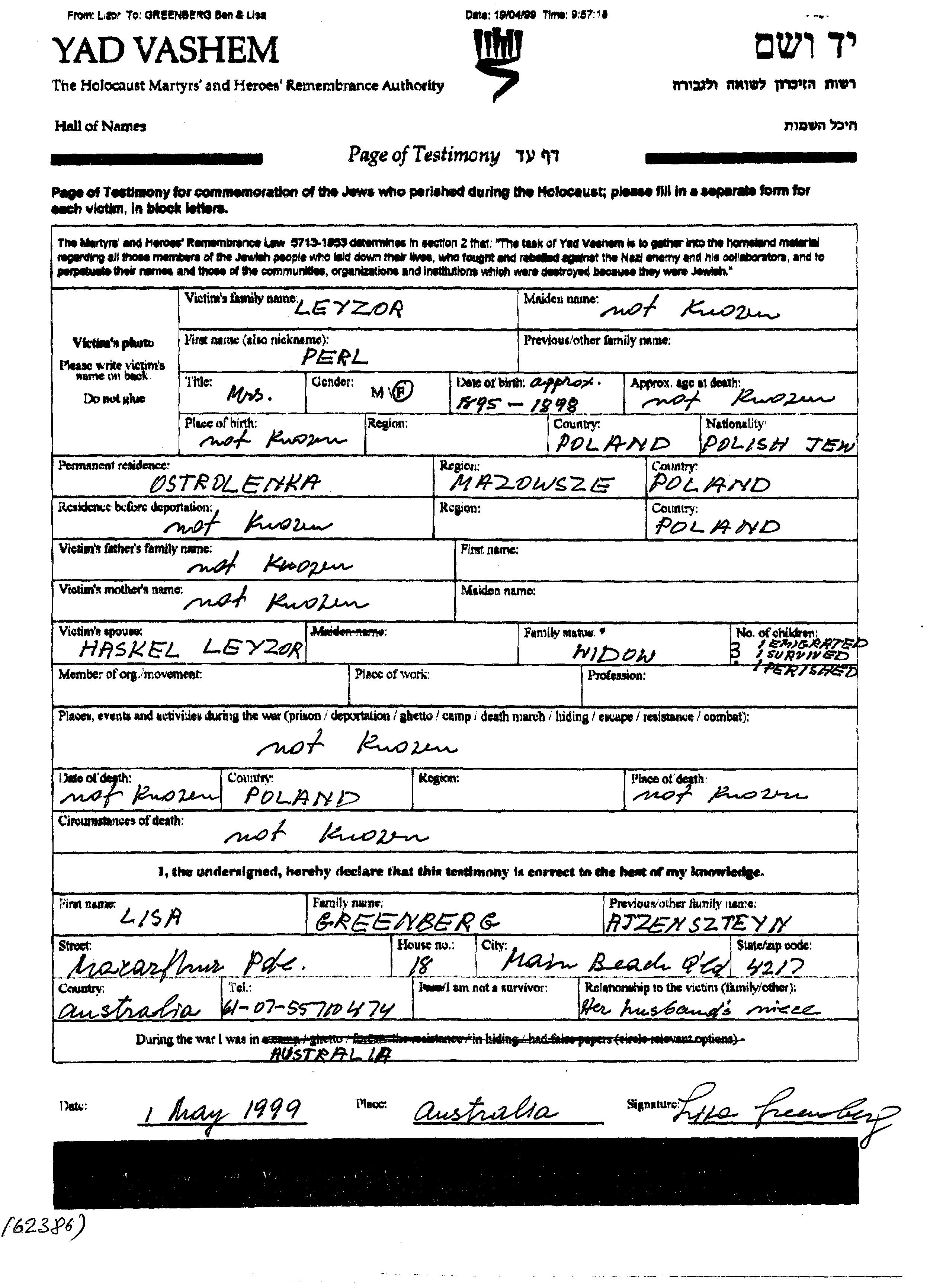 Perl Leyzor est née à Pologne en 1895. Elle était veuve de Haskel. Avant la seconde guerre mondiale elle vivait à Ostrolenko, Pologne. Pendant la guerre, elle était à Pologne.
