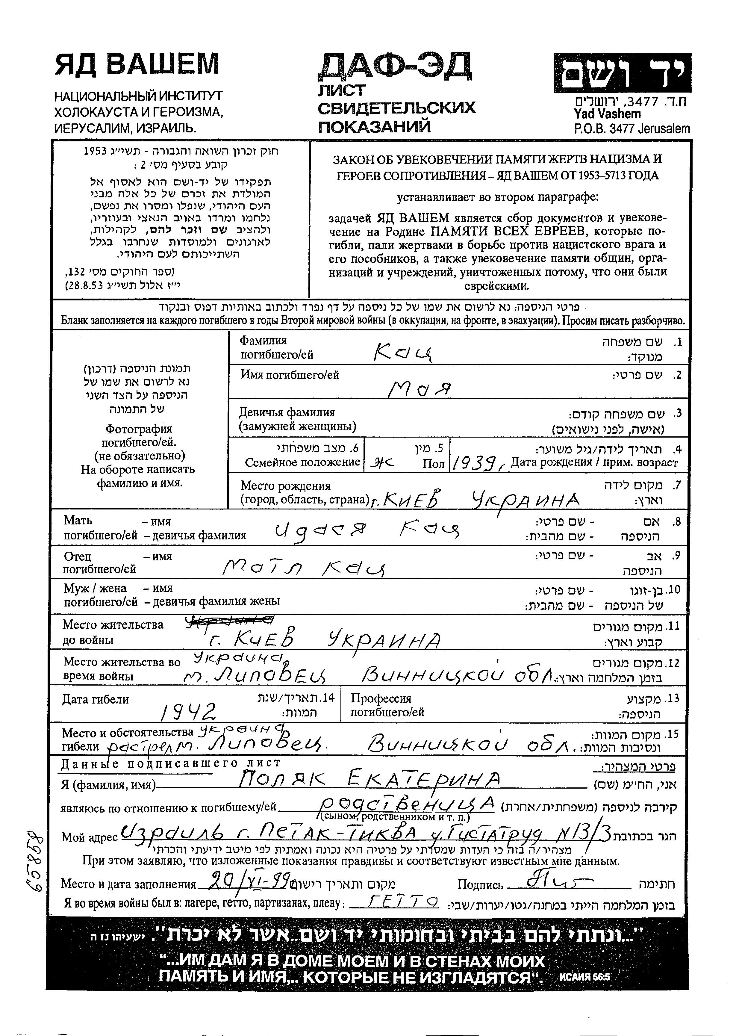 Katz Maya 1939 Kiev, Ukraine (URSS) Feuille de témoignage