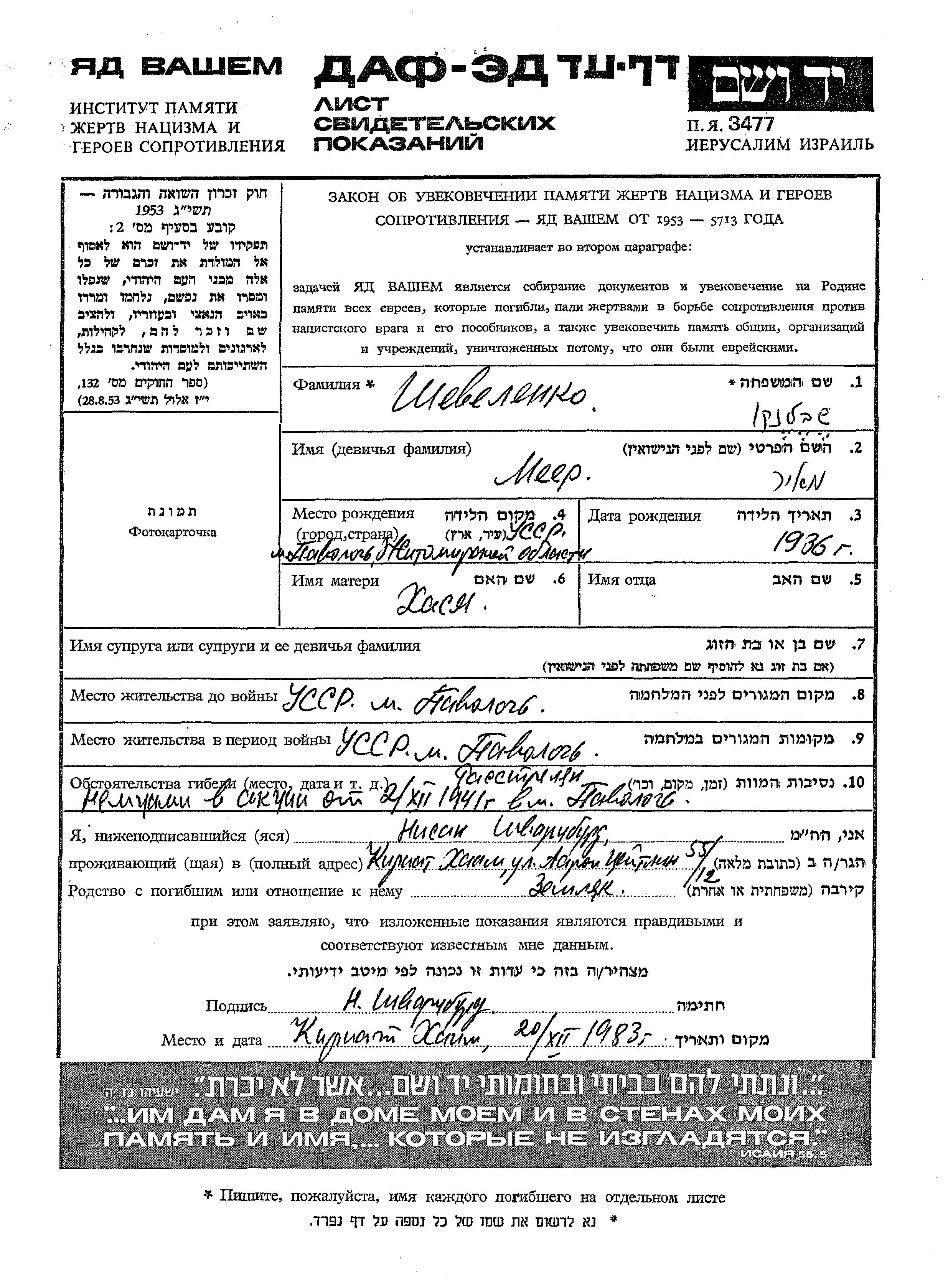 Meyer Shevelenko est né à Pavoloch, Ukraine (URSS) en 1936, fils de Khasya. Il était Enfant. Avant la seconde guerre mondiale il vivait à Pavoloch, Ukraine (URSS). Au cours de la guerre, il était à Pavoloch, Ukraine (URSS).