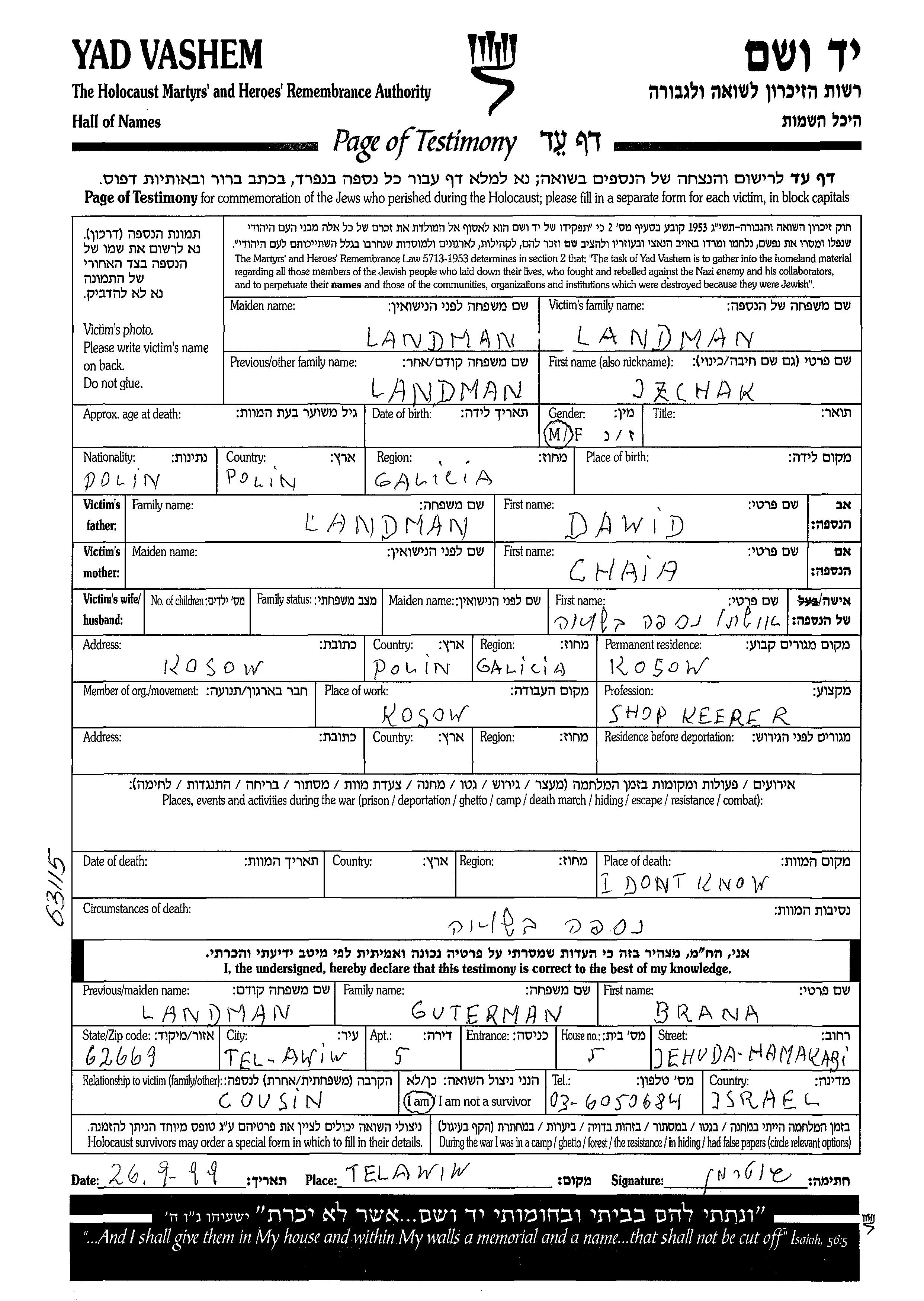 Landman Izchak Kosow, Pologne Feuille de témoignage
