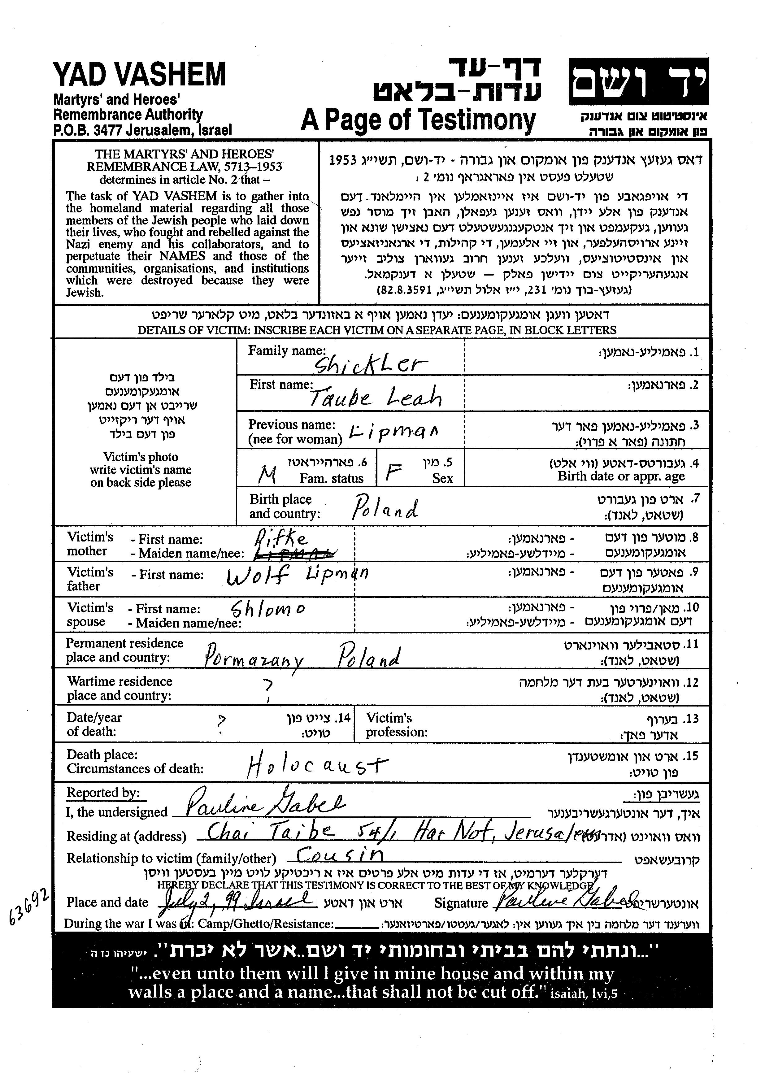 Shickler Tauba Leah Pomorzany, Pologne Feuille de témoignage