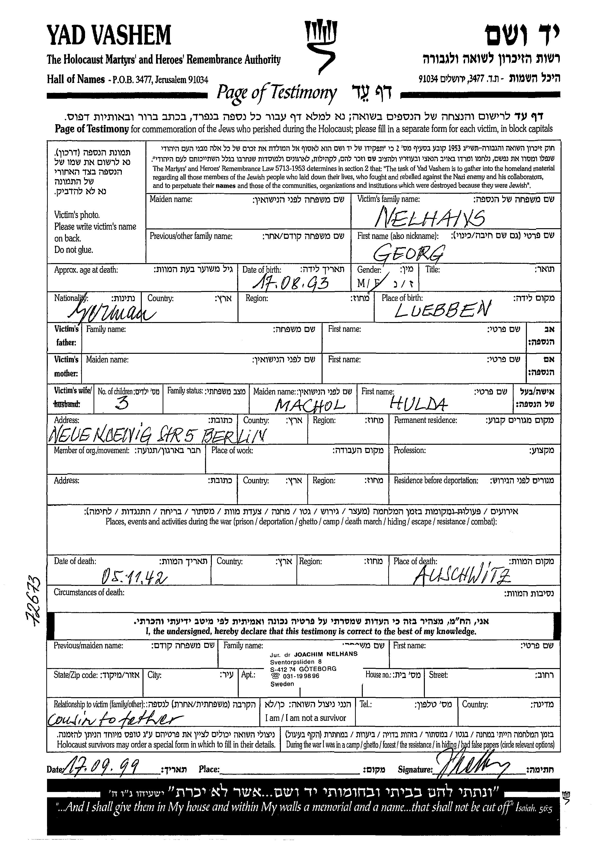 Georg Nelhans est né à Luebben, Allemagne en 1893. Il était Mariée à Hulda née Machol. Avant la seconde guerre mondiale il vivait à Berlin, Allemagne.