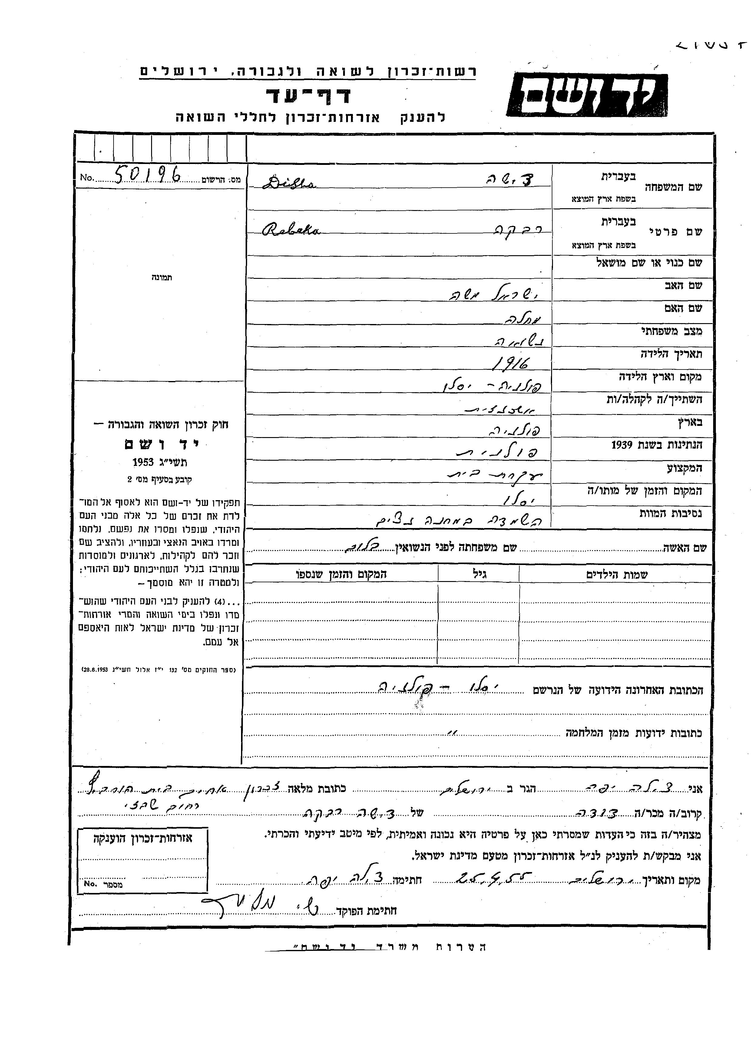 Rebeka Disha est née à Jaslo, Pologne en 1916, fille de Yisrael Moshe et de Makhla. Elle était Femme au foyer. Avant la seconde guerre mondiale elle vivait à Pologne. Pendant la guerre, elle était à Jaslo, Pologne.