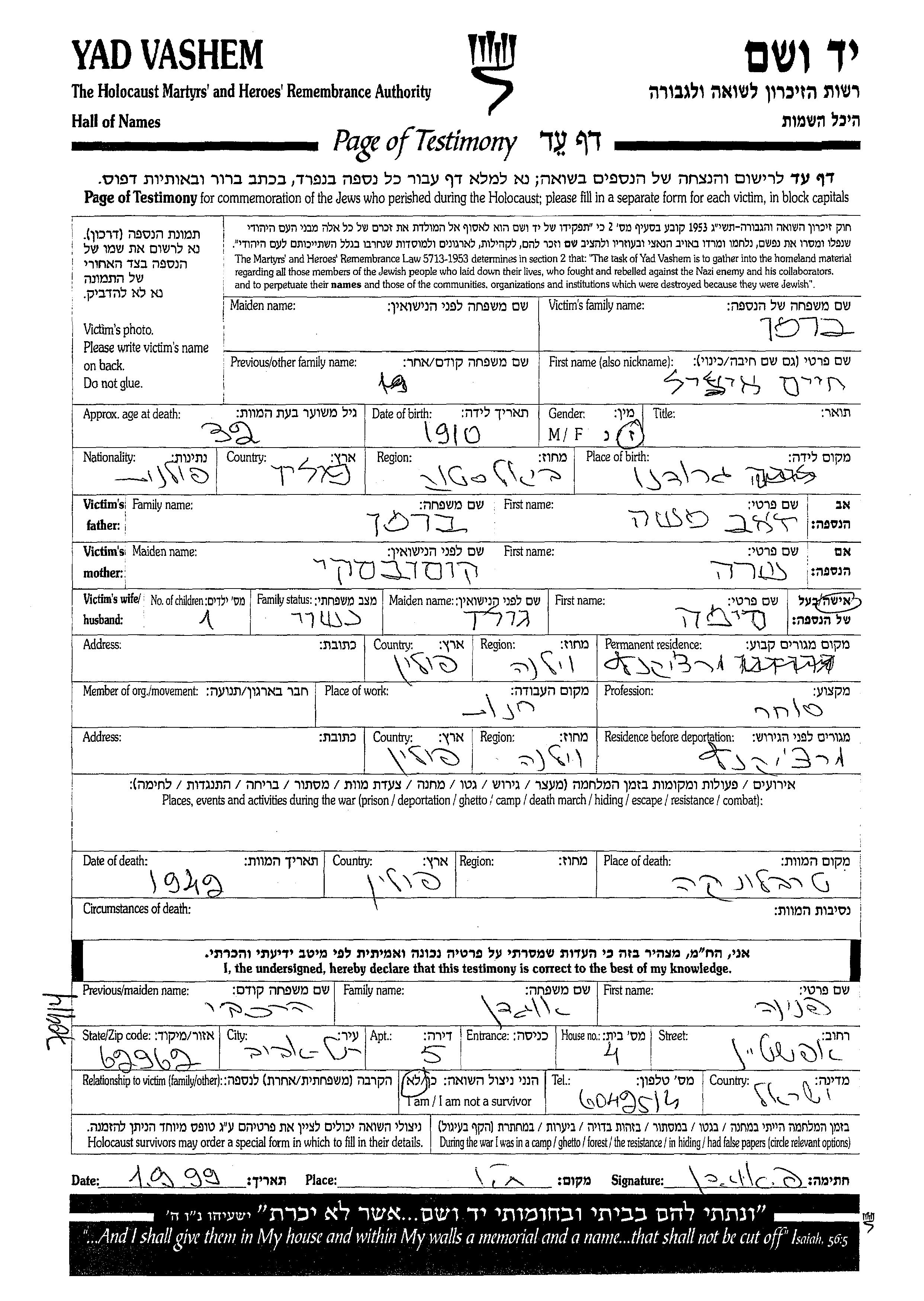 Yad Vashem - Pages of Testimony Names Memorial Collection